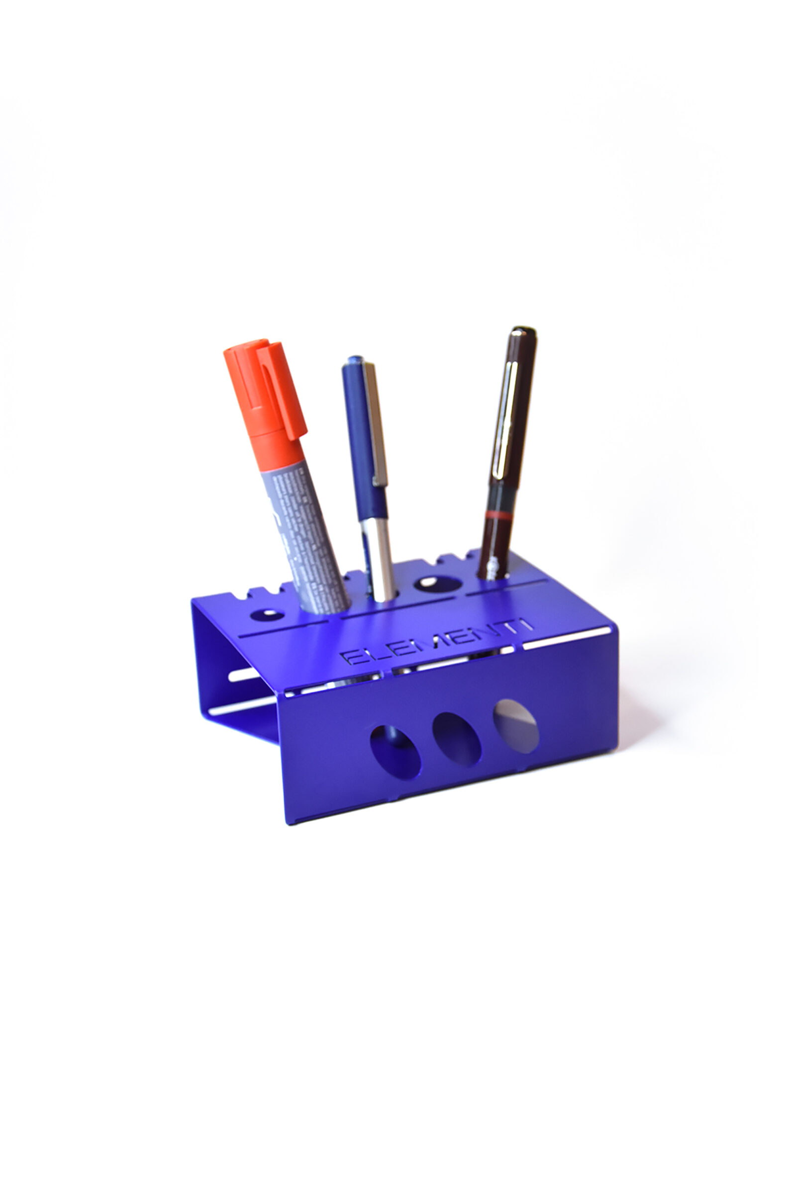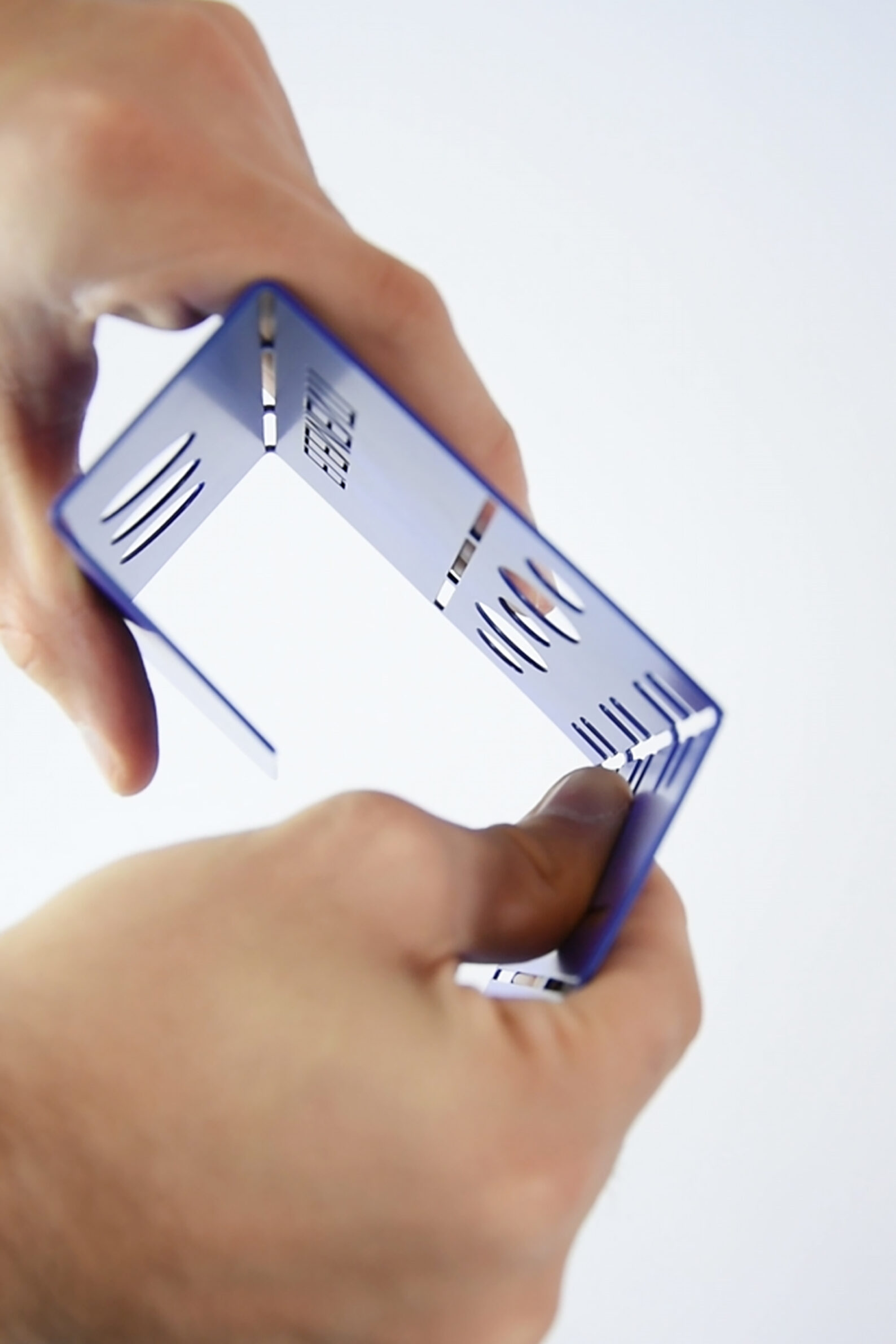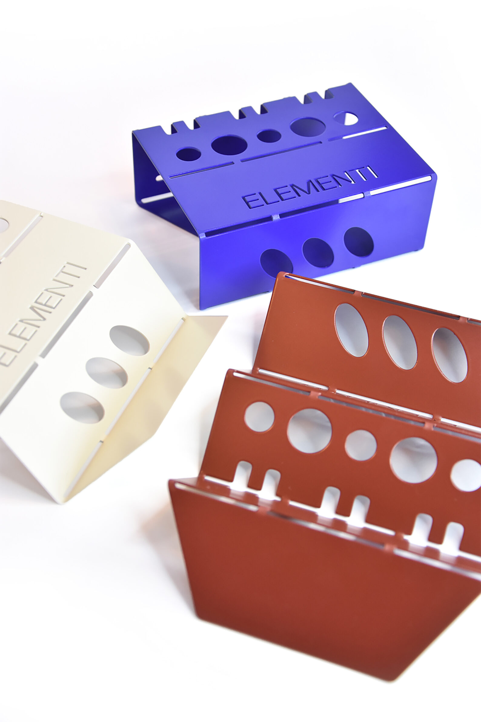 Specially designed slots deliberately weaken the metal at precise points, allowing controlled hand bending without tools. The holder can be formed into eight intended configurations, each resulting in a distinct form and function. These primary bending lines are complemented by additional laser-cut openings that suggest specific uses, guiding the user without prescribing a single outcome.