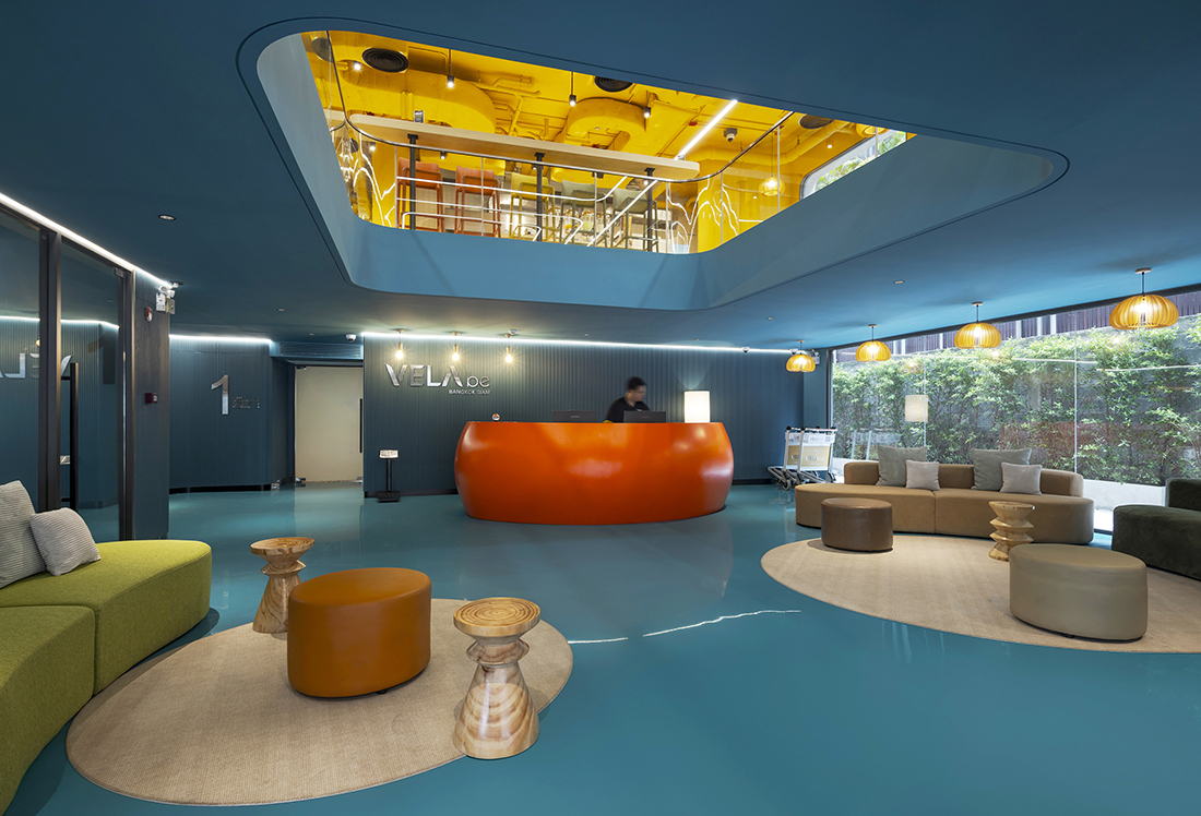 The exterior is adorned with stainless steel chain links, adding a contemporary flair that represents the mosquito nets traditionally used by Thai people to cover their beds while sleeping. Upon entering, guests are greeted by a lively interior that celebrates the essence of Thailand through a vibrant colour palette inspired by Thai tones. This is especially evident in the communal spaces, where bright hues and intricate designs evoke the spirit of Thai culture, creating an inviting and energetic atmosphere.
