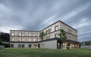 The entire building has a modernist architecture with clean lines, but also carries echoes of architectural traditions like the use of local materials such as stone and wood. The main goal of the project was to merge the building with the surrounding natural alpine landscape.