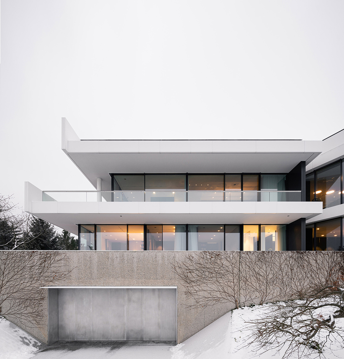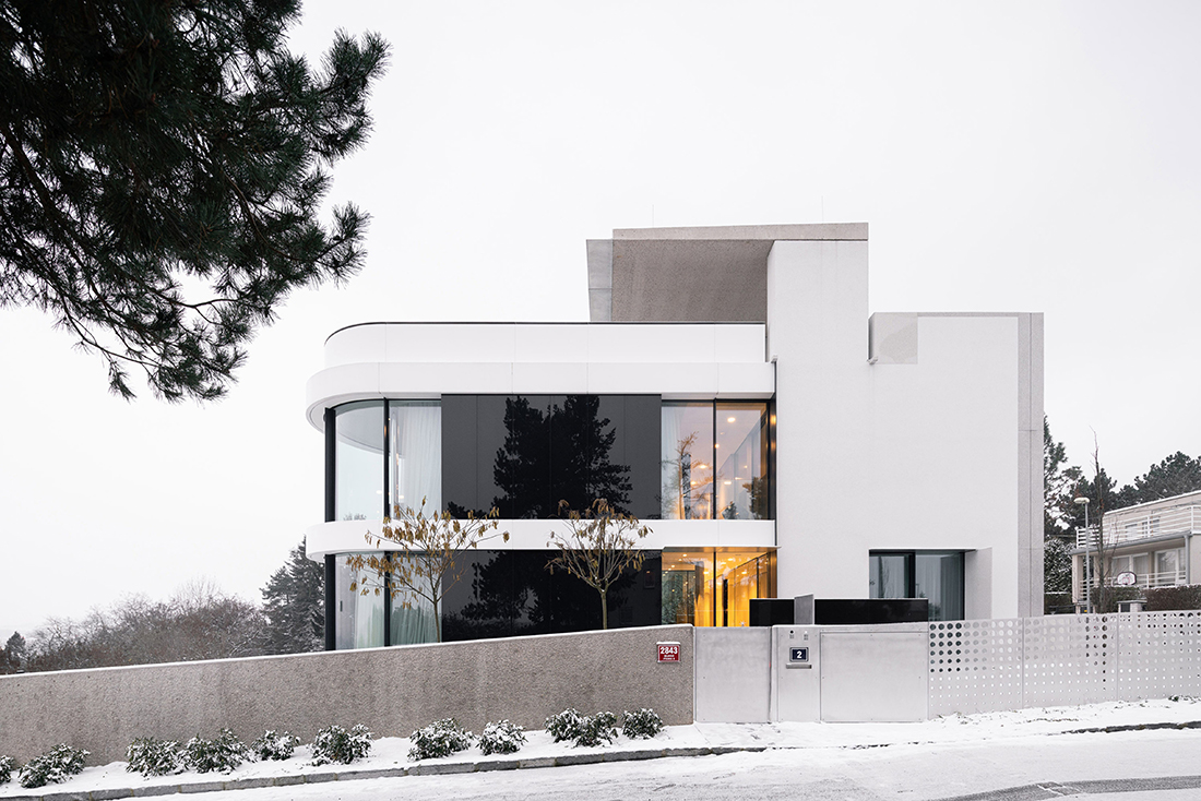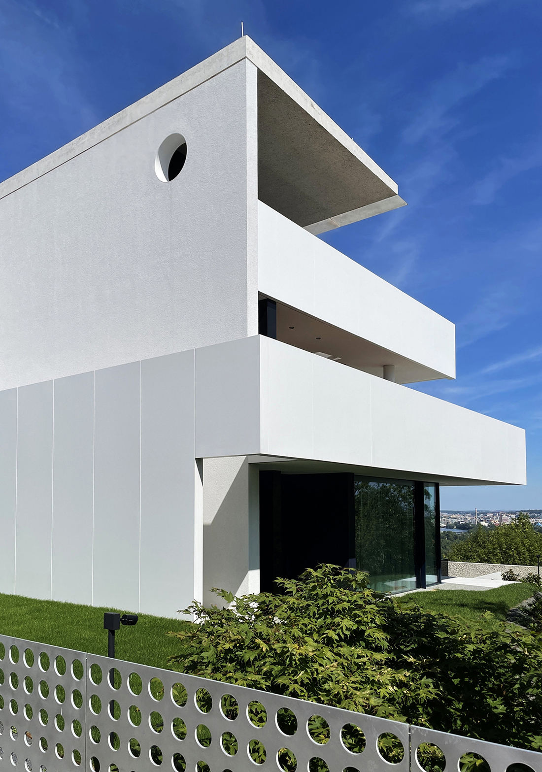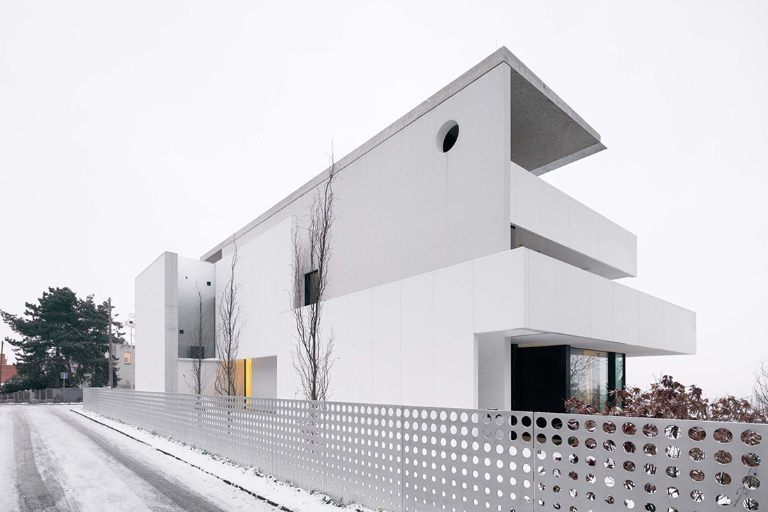 Cladding of a family house façade in Baba with LG Hi-Macs in white, dark blue, and black.