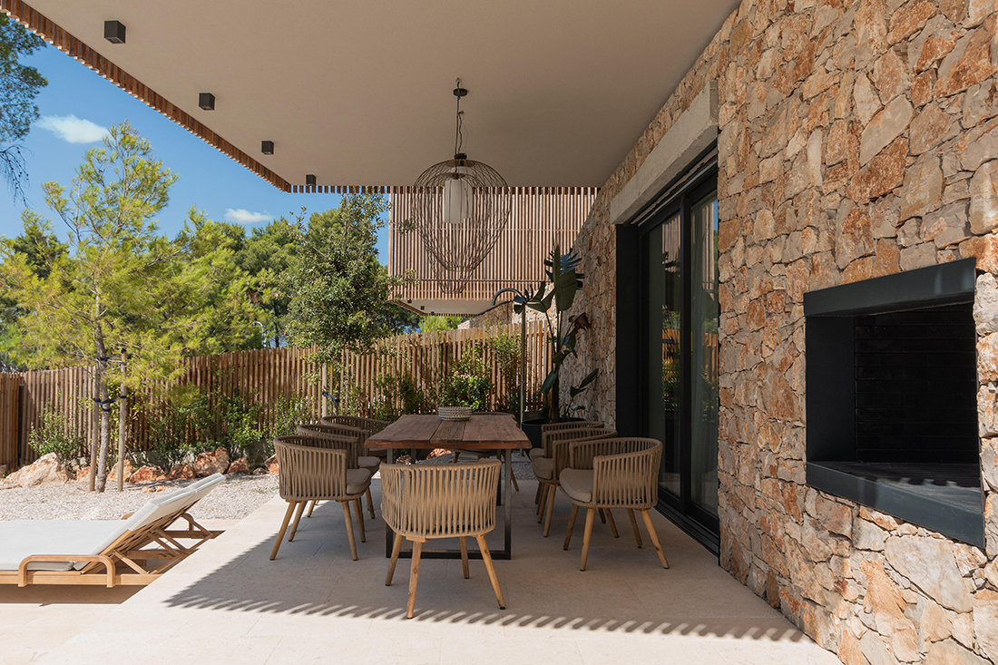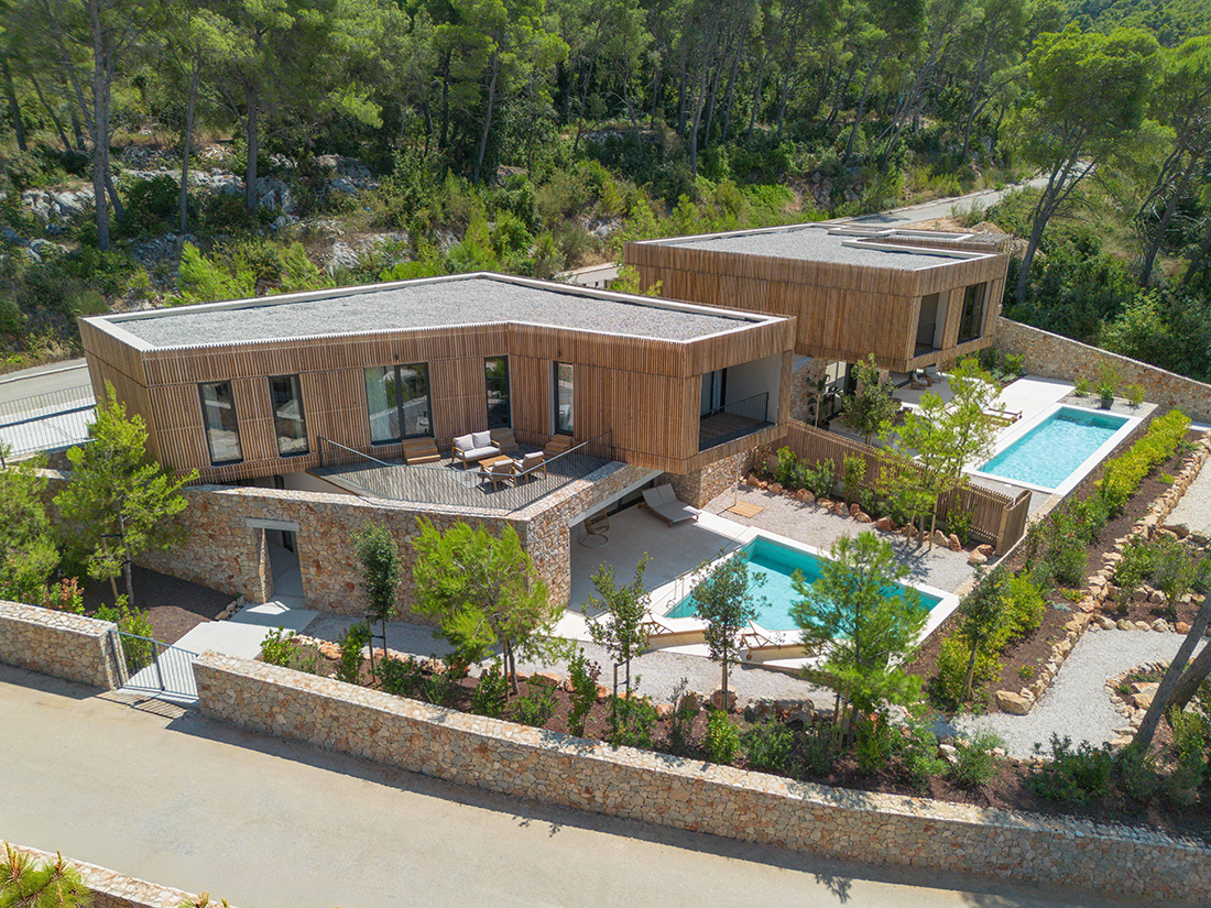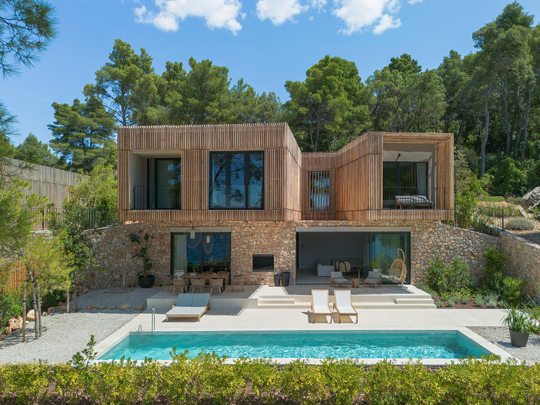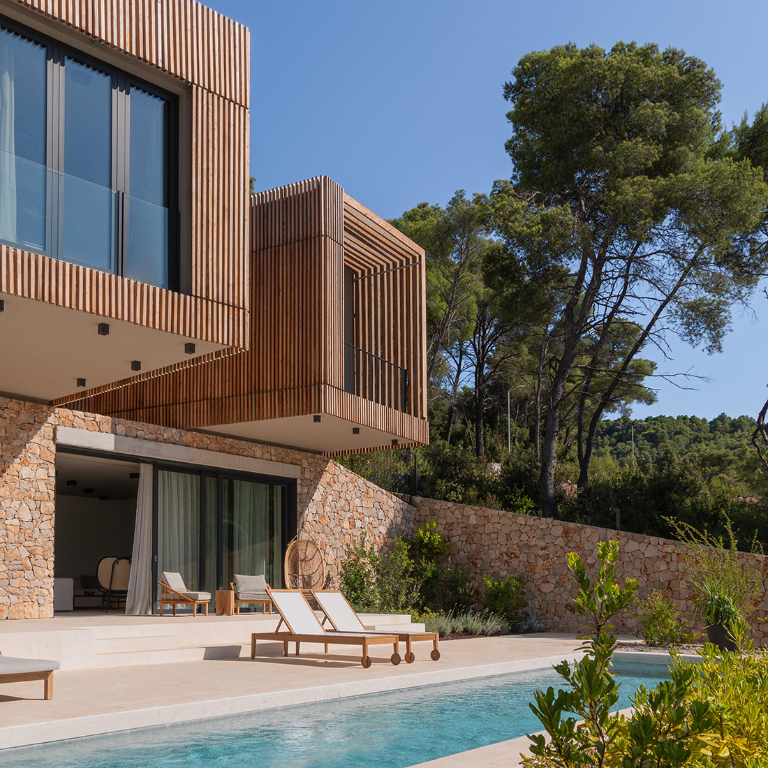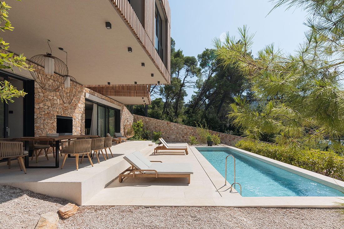 The layout of the villas separates social and private spaces, with the living areas on the ground floor effortlessly connecting to the garden and pool. The upper-floor bedrooms provide privacy while offering elevated views of the surrounding landscape. Timeless materials such as locally sourced stone and timber were chosen to harmonize with the environment. The end result is a serene retreat where the design subtly enhances the natural beauty of the site.