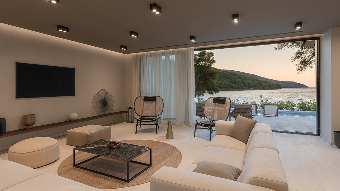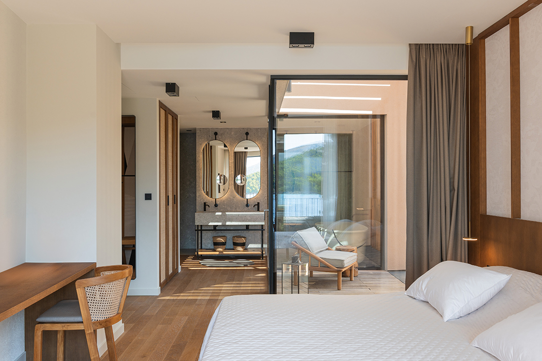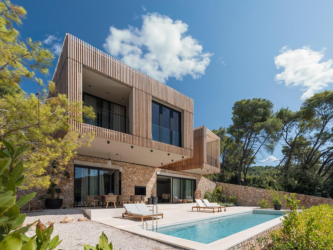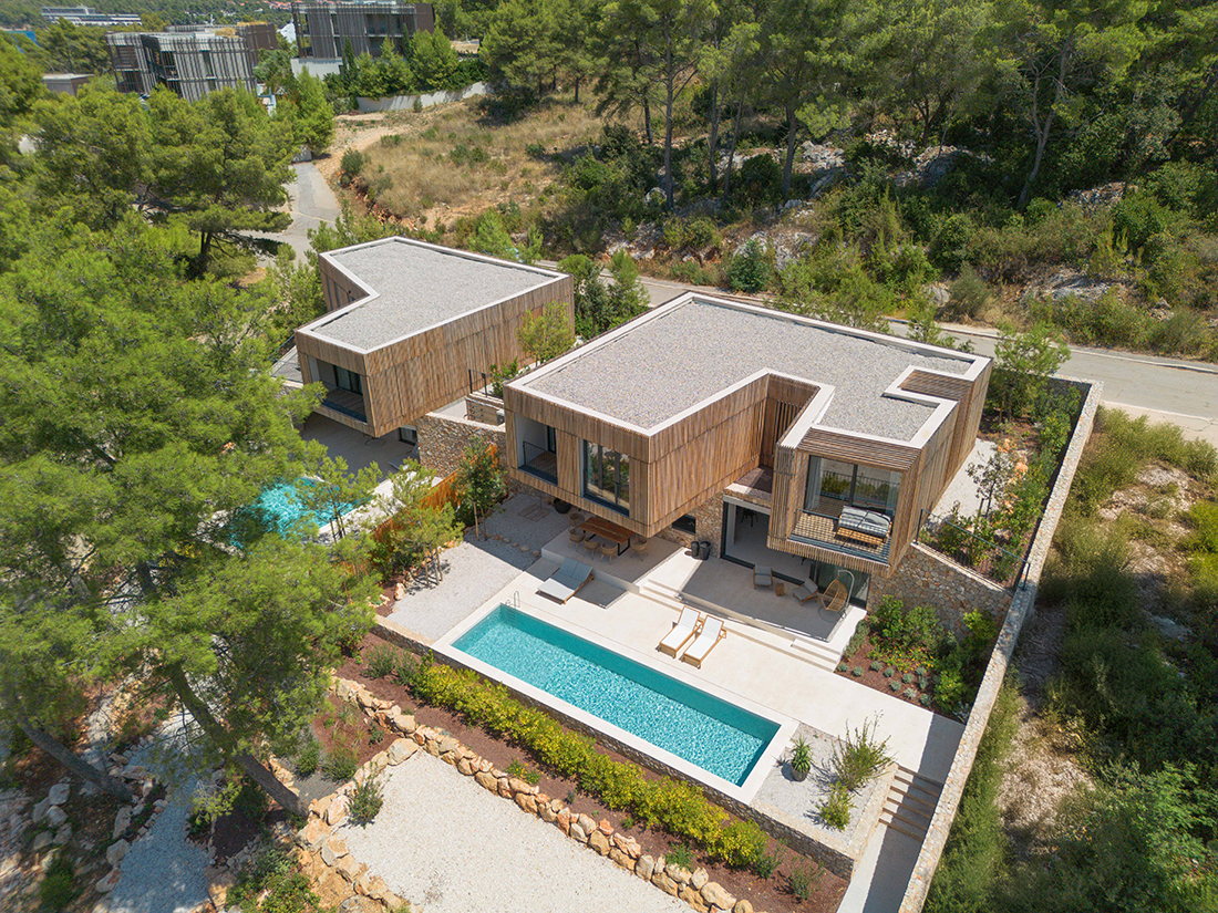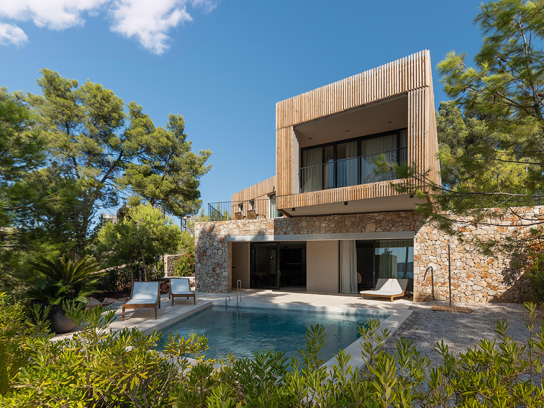 The layout of the villas separates social and private spaces, with the living areas on the ground floor effortlessly connecting to the garden and pool. The upper-floor bedrooms provide privacy while offering elevated views of the surrounding landscape. Timeless materials such as locally sourced stone and timber were chosen to harmonize with the environment. The end result is a serene retreat where the design subtly enhances the natural beauty of the site.