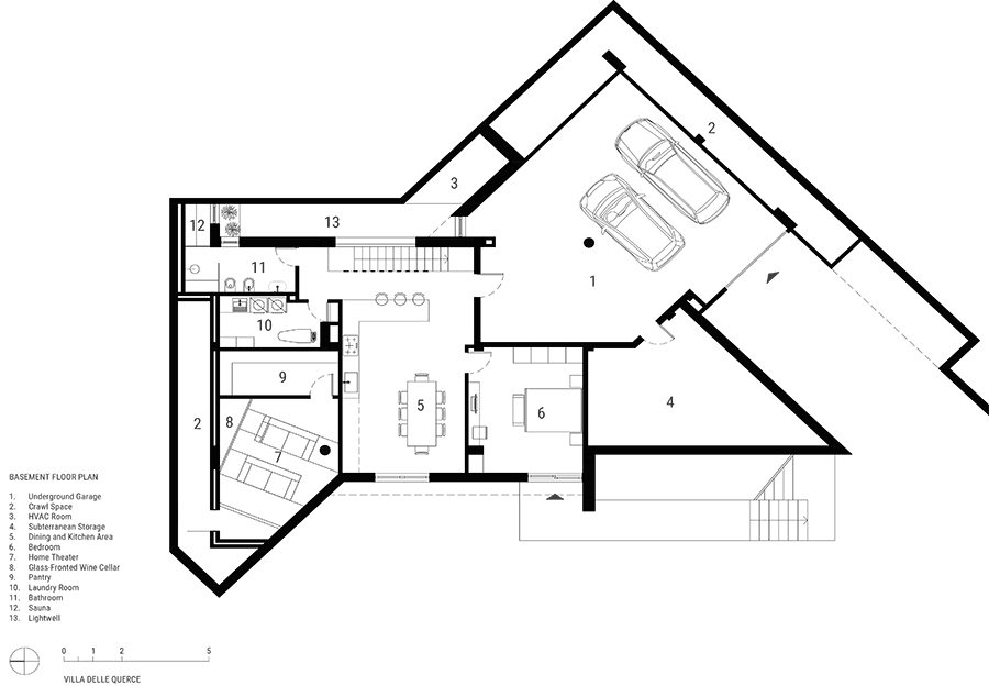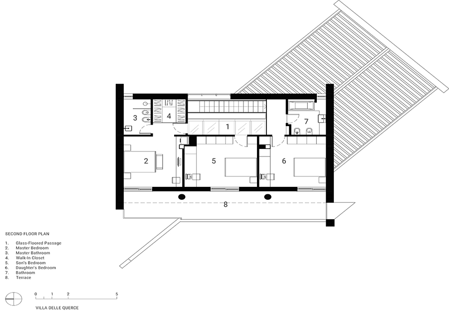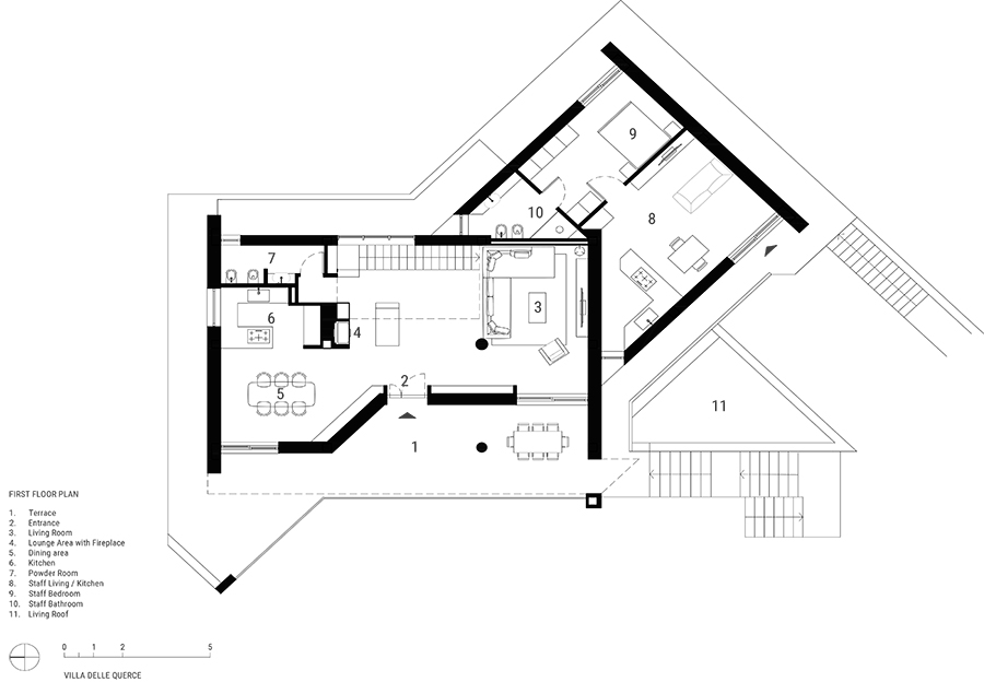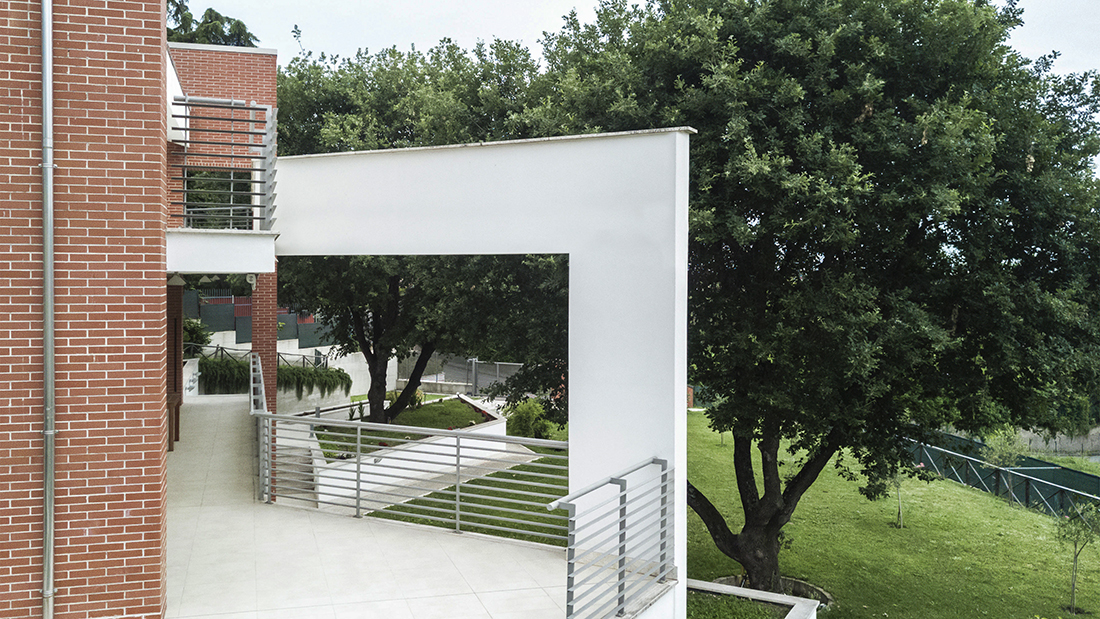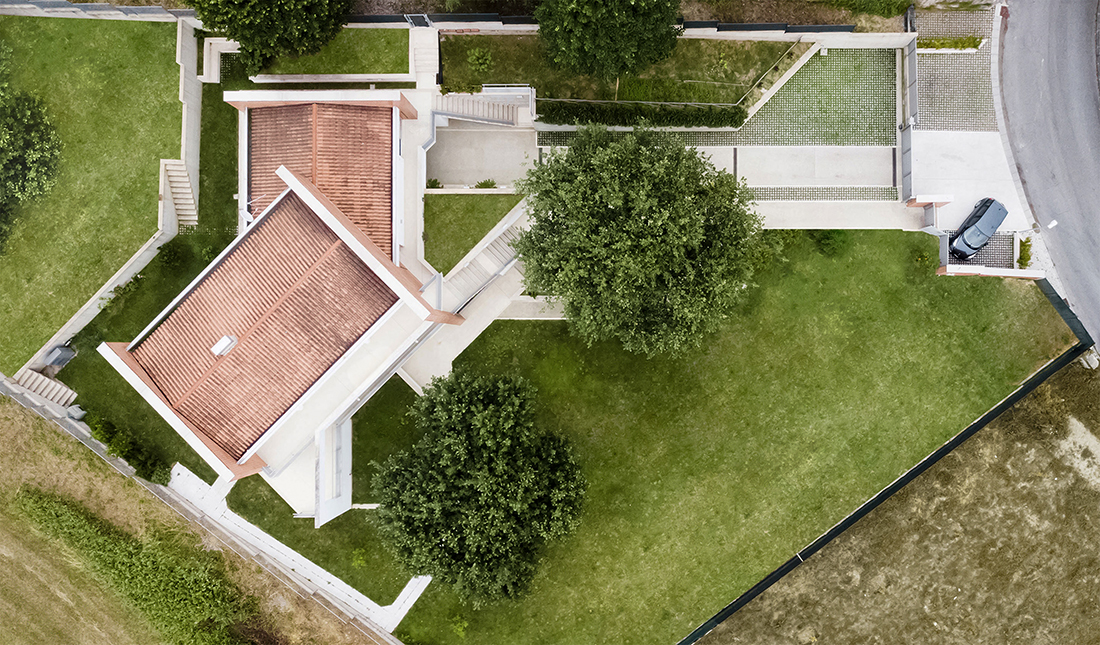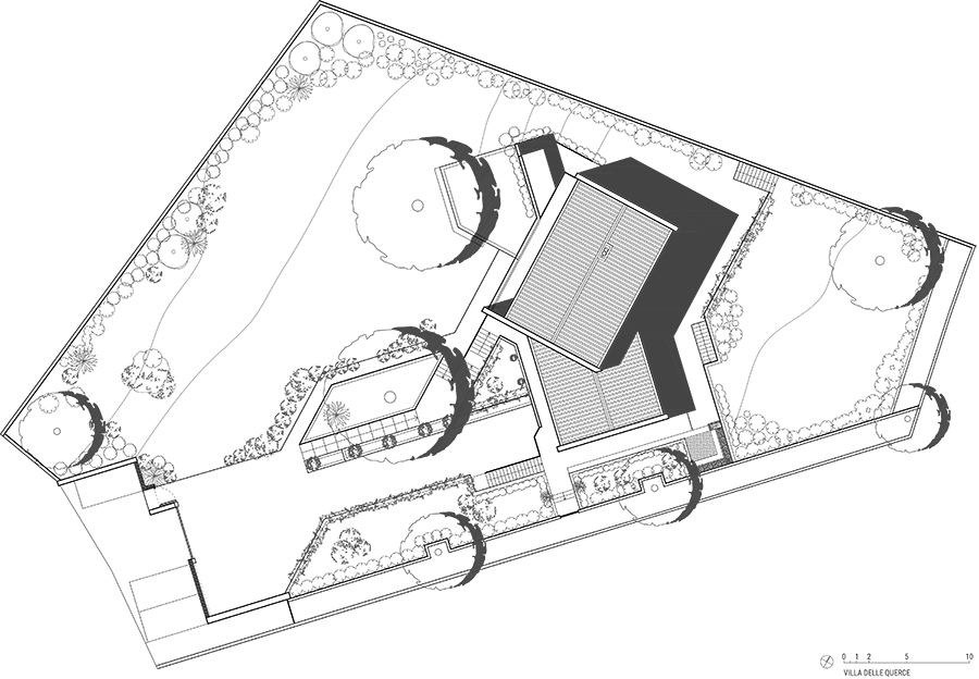 Villa delle Querce is a modern residence in Riano, surrounded by greenery just 15 minutes from the center of Rome. The design revolves around three majestic oak trees, which define a 45° geometric grid and guide the spatial layout. The villa consists of two distinct structures – the main house and a dépendance – both characterized by masonry walls that create striking plays of light and shadow on the façades.