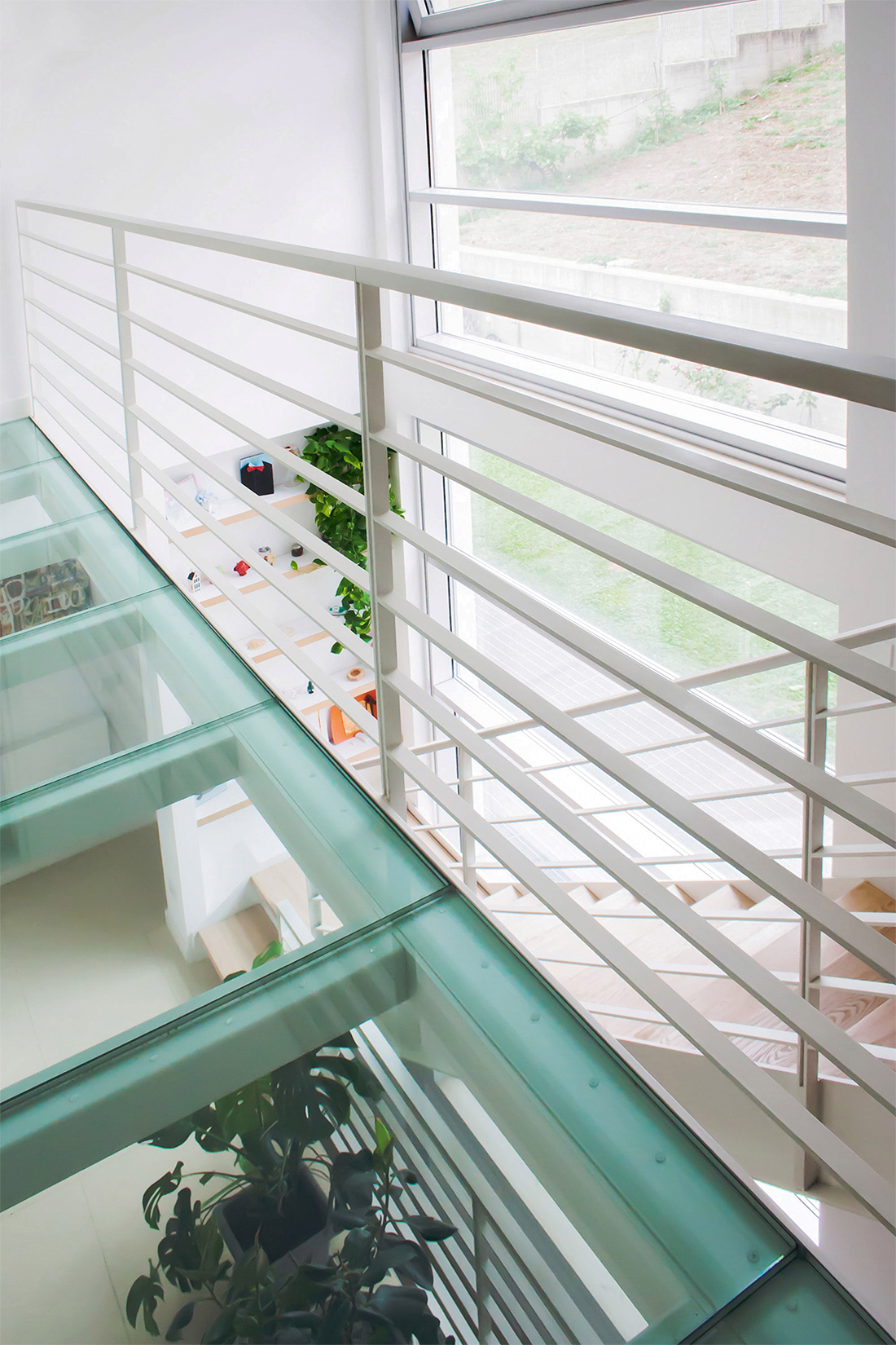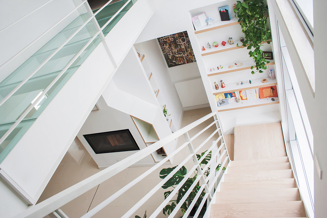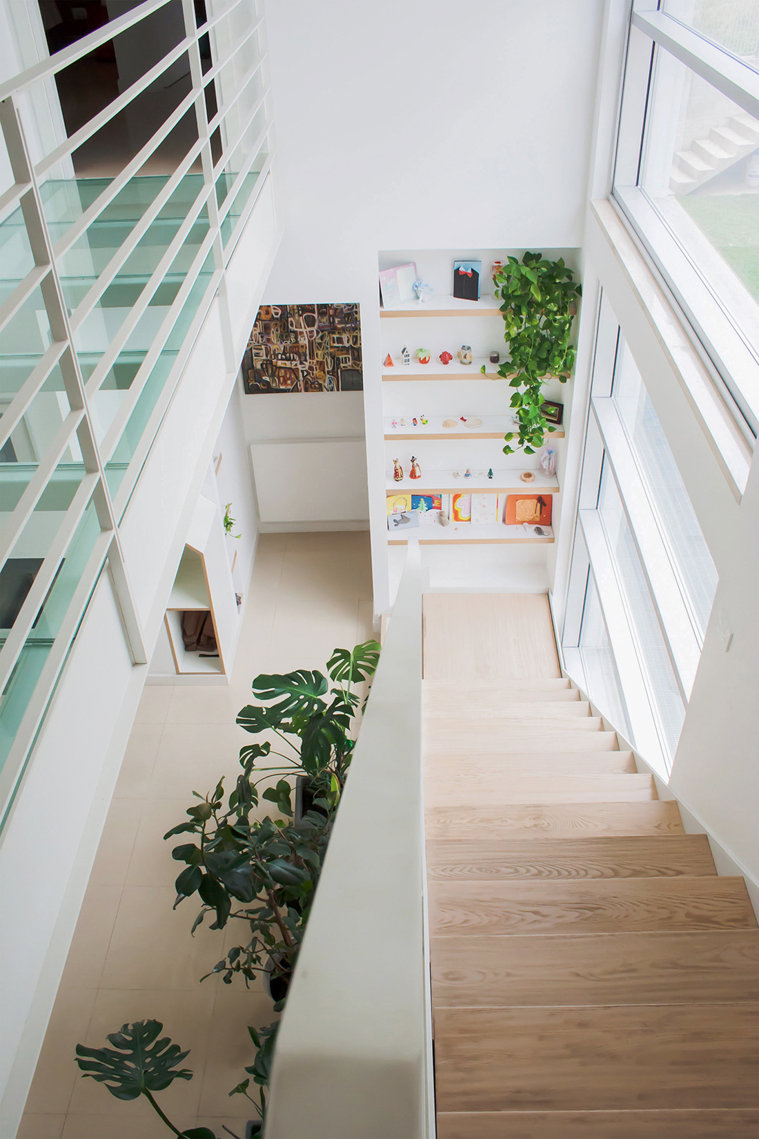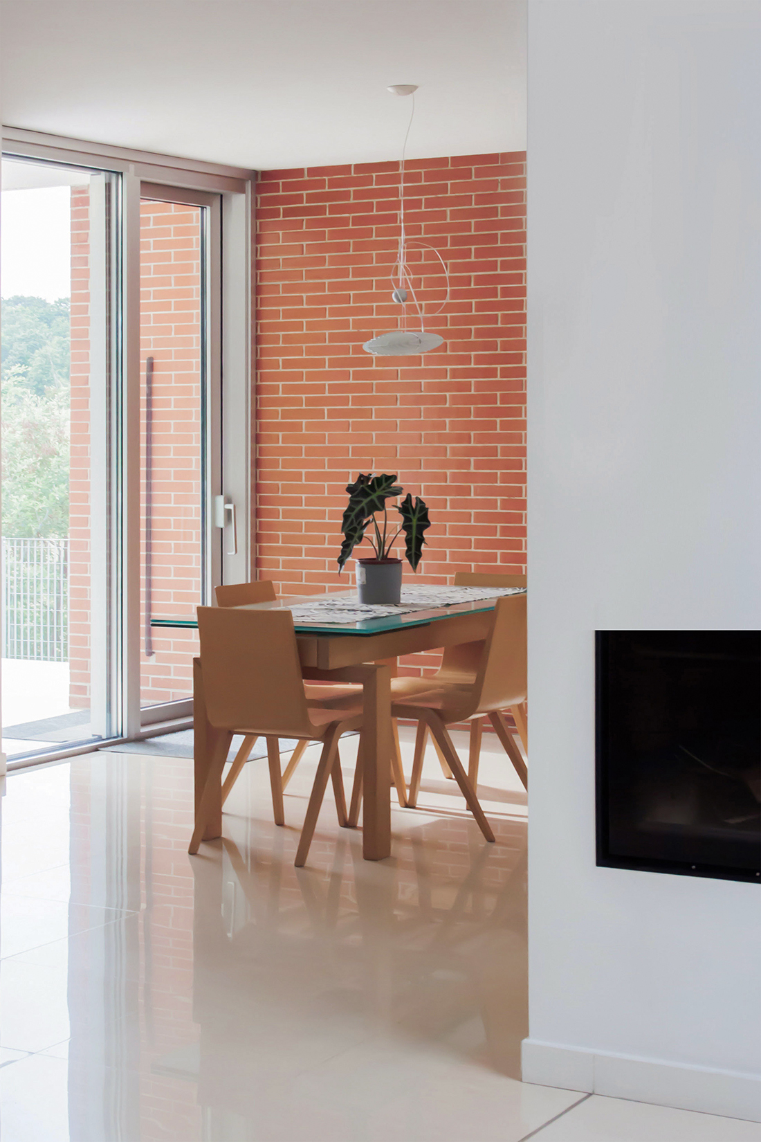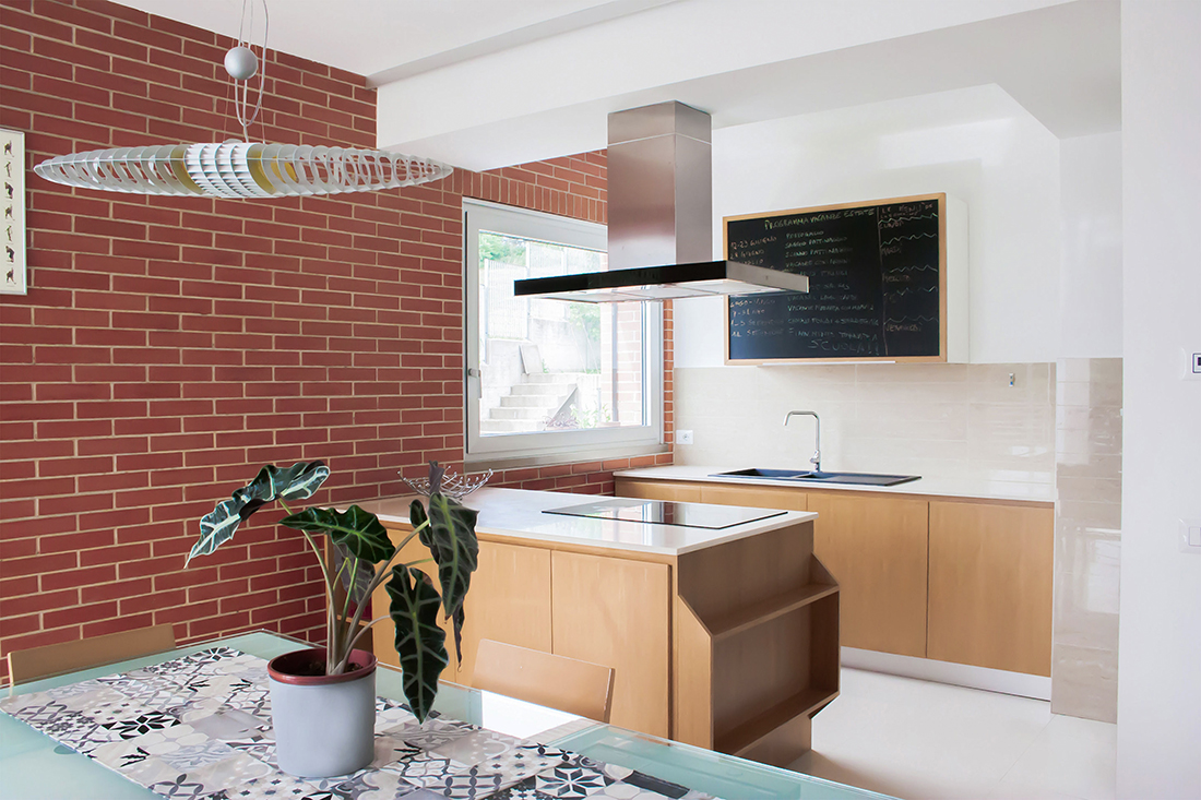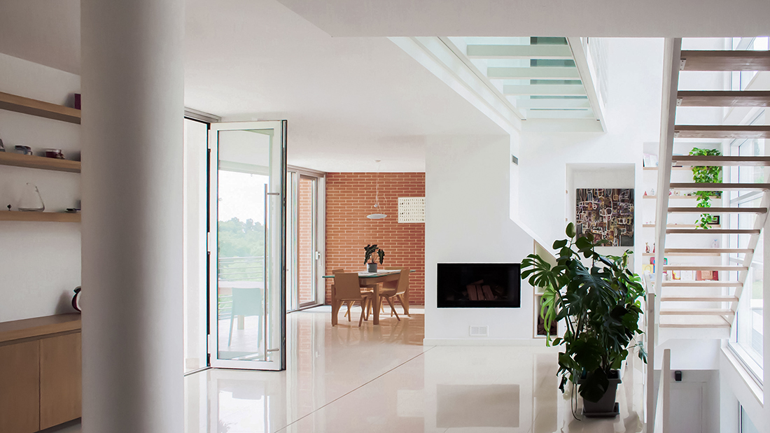 Inside, the spaces seamlessly blend with the outdoors through continuous walls and carefully selected materials: exposed brick in rich tones contrasts with the bright white interiors, complemented by light wood and neutral hues. The living room, with its double-height ceiling and glass wall, is bathed in natural light, while an iron and glass staircase serves as a transition between the daytime living area and the private night zone upstairs, which features two bedrooms and a master suite with a walk-in closet and private bathroom.