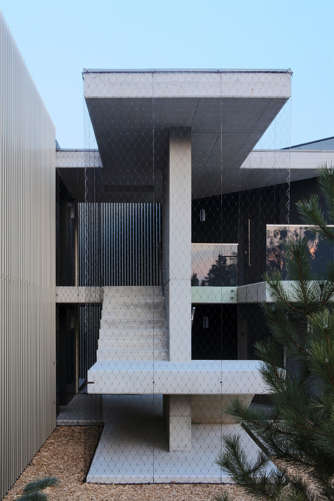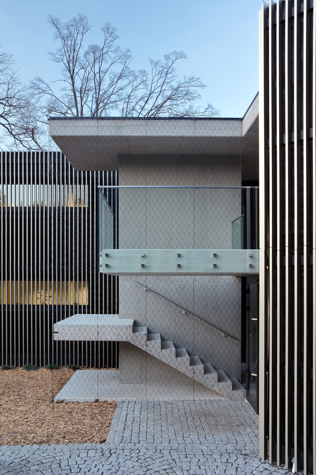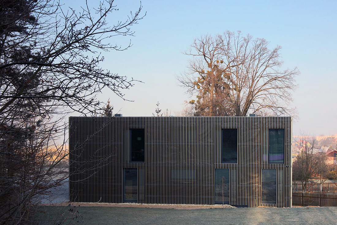 The northern prism has a basement and offers a garage in the basement, while the adjoining 1st and 2nd floors each contain 1 residential unit. The southern prism offers a garage on the ground floor, and on the 2nd floor, an apartment with beautiful views of the landscape. Each of the living spaces of all apartments offers views of the majestic surrounding greenery of linden trees and pine trees. The lamella façade, metal and glass in the exterior, and concrete, glass, and wood in the interior create a dualism of the internal and external nature of the house, reflecting the clash of the natural and built environment.