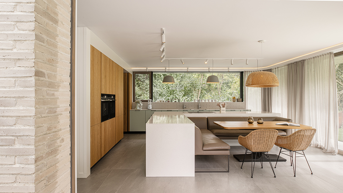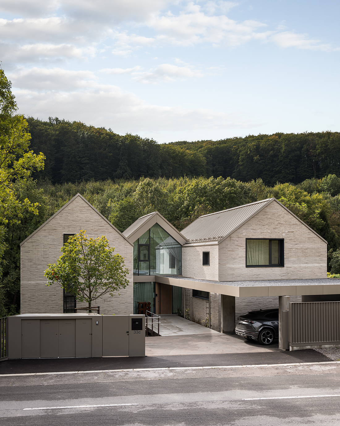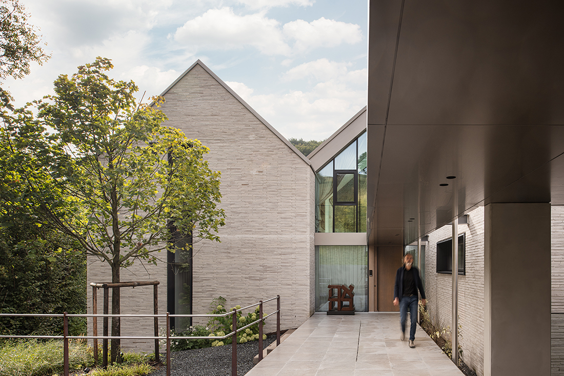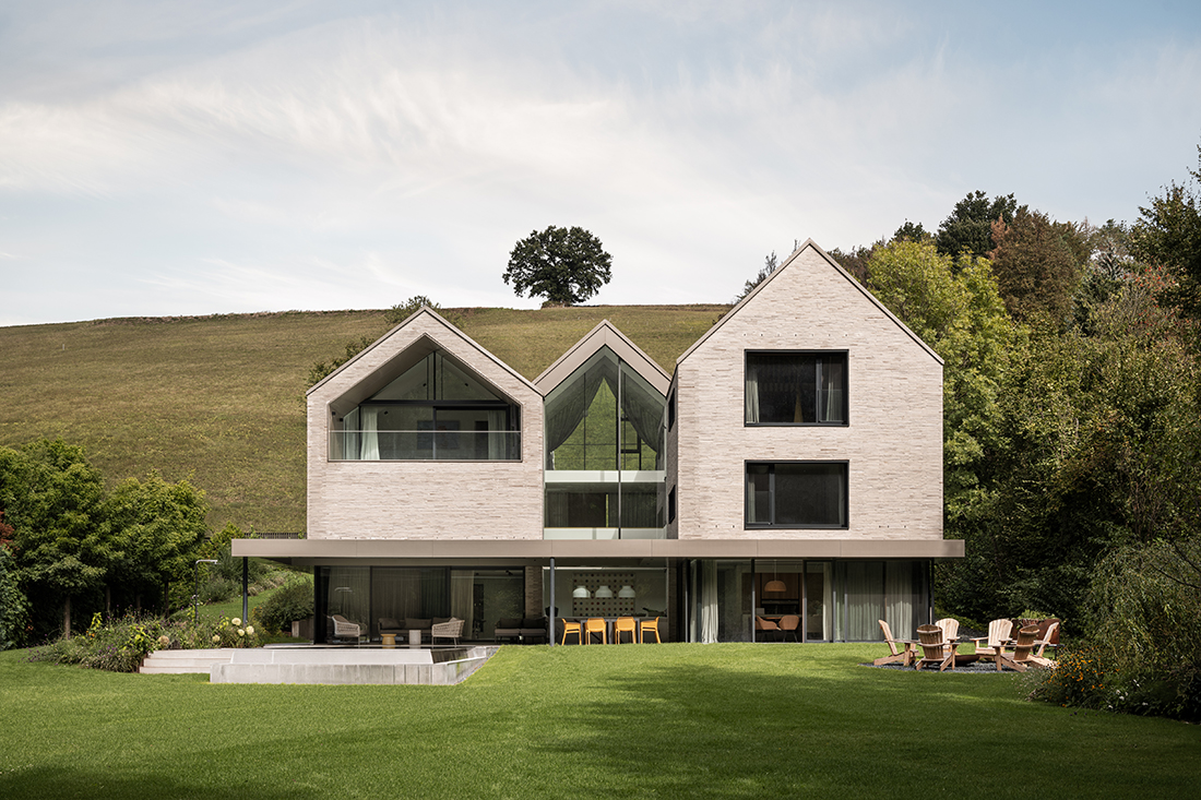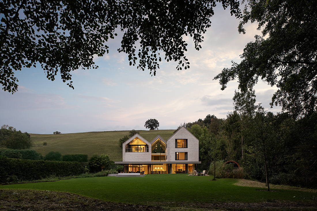 Under the three gables, separate areas provide privacy and retreat, while the garden level invites moments of shared enjoyment. A three-story atrium channels natural light, serving as a central connective space and offering walls for an art collection. The vibrant clinker façade harmonizes with the surrounding landscape, which is framed by carefully placed windows.