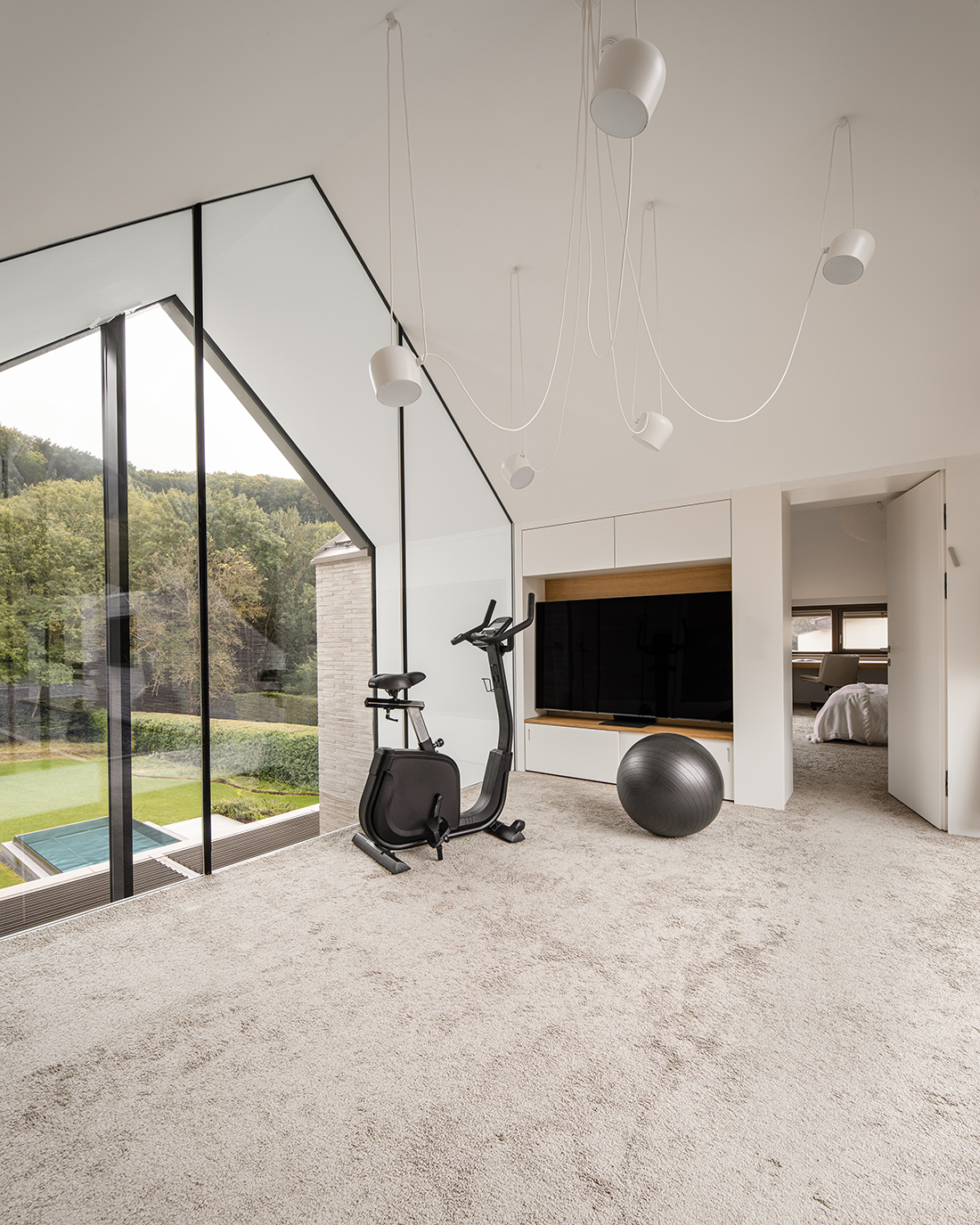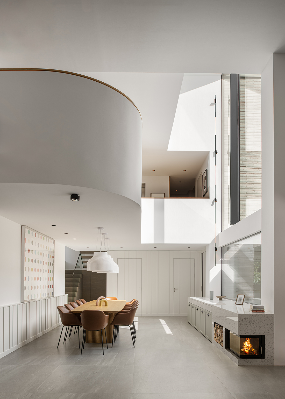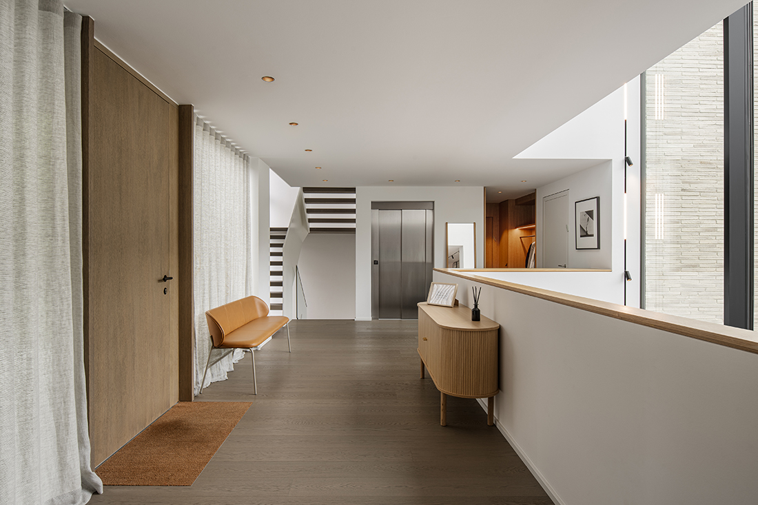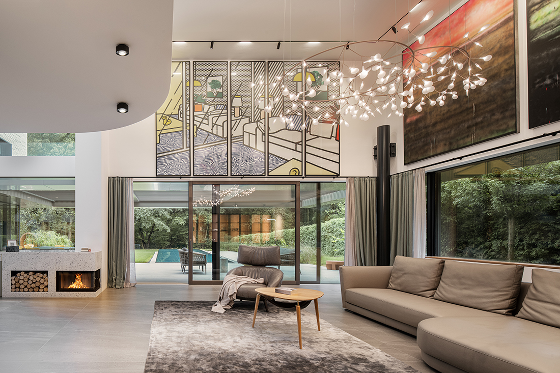 Under the three gables, separate areas provide privacy and retreat, while the garden level invites moments of shared enjoyment. A three-story atrium channels natural light, serving as a central connective space and offering walls for an art collection. The vibrant clinker façade harmonizes with the surrounding landscape, which is framed by carefully placed windows.