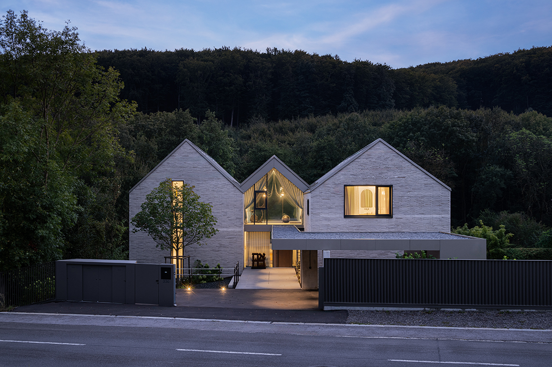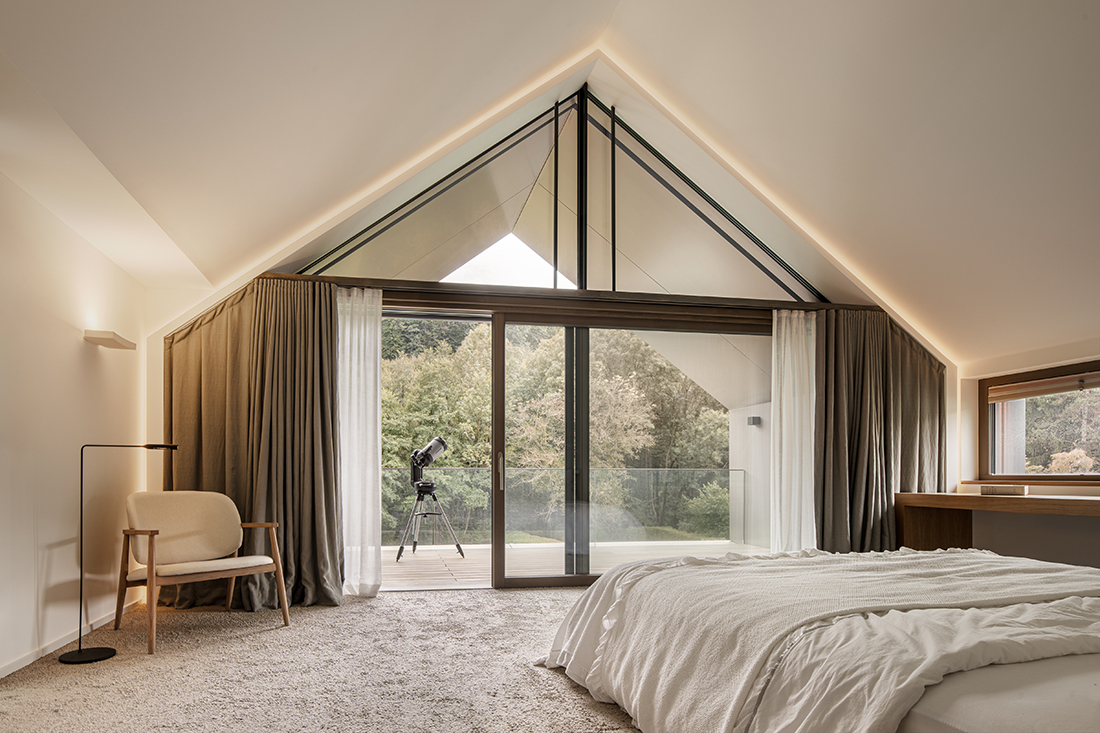 The protective shell of the house gradually opens toward the garden, blurring the boundaries between indoors and outdoors. Designed for minimal maintenance and energy consumption, the house is self-sustaining even when uninhabited.