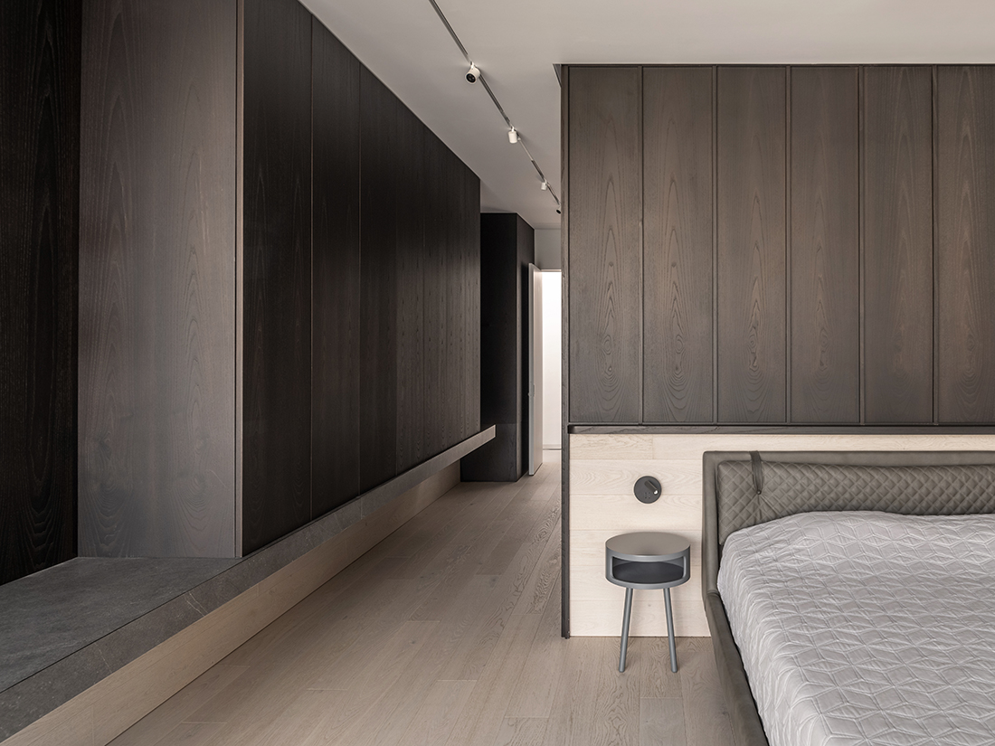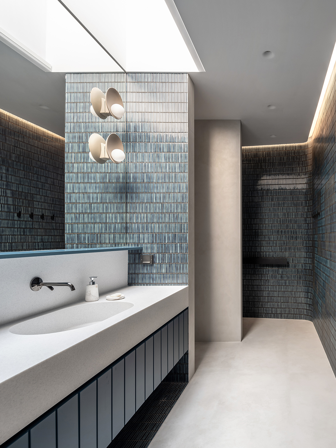 At the ground level, the main areas – including the living room, kitchen, and bedrooms – are designed to engage with the surrounding landscape while maintaining privacy. Large openings, paired with the seamless transition of the interior flooring extending into the outdoor dining area, create a fluid connection between the interior and nature. As a result, the ground floor is experienced as a light and transparent space, in constant dialogue with the garden and pool.