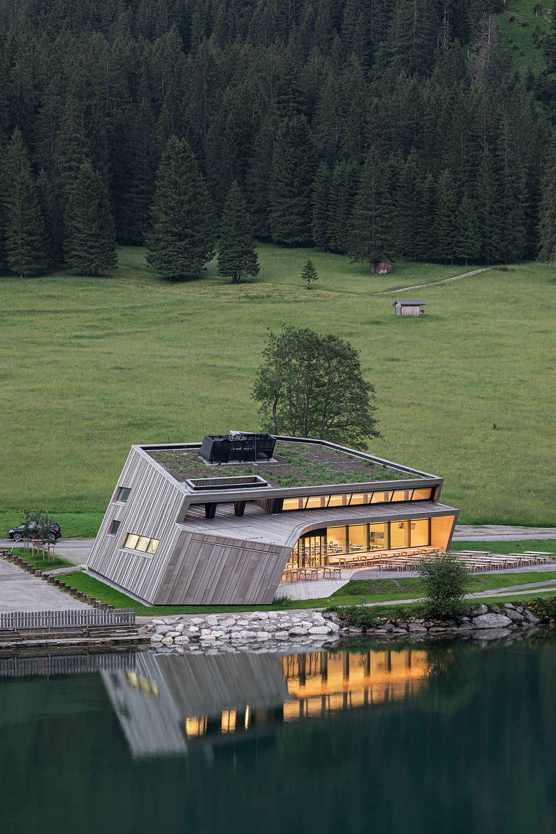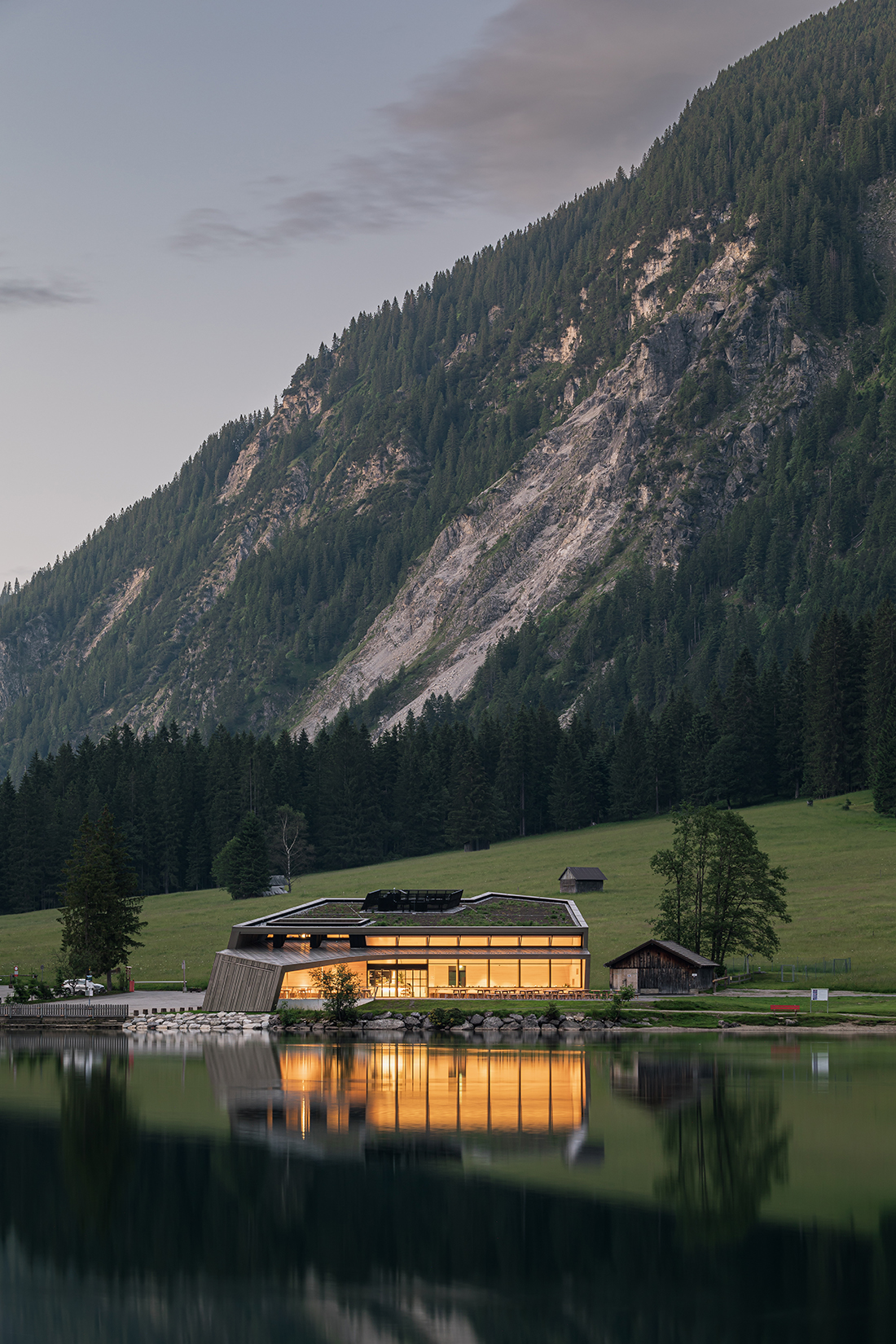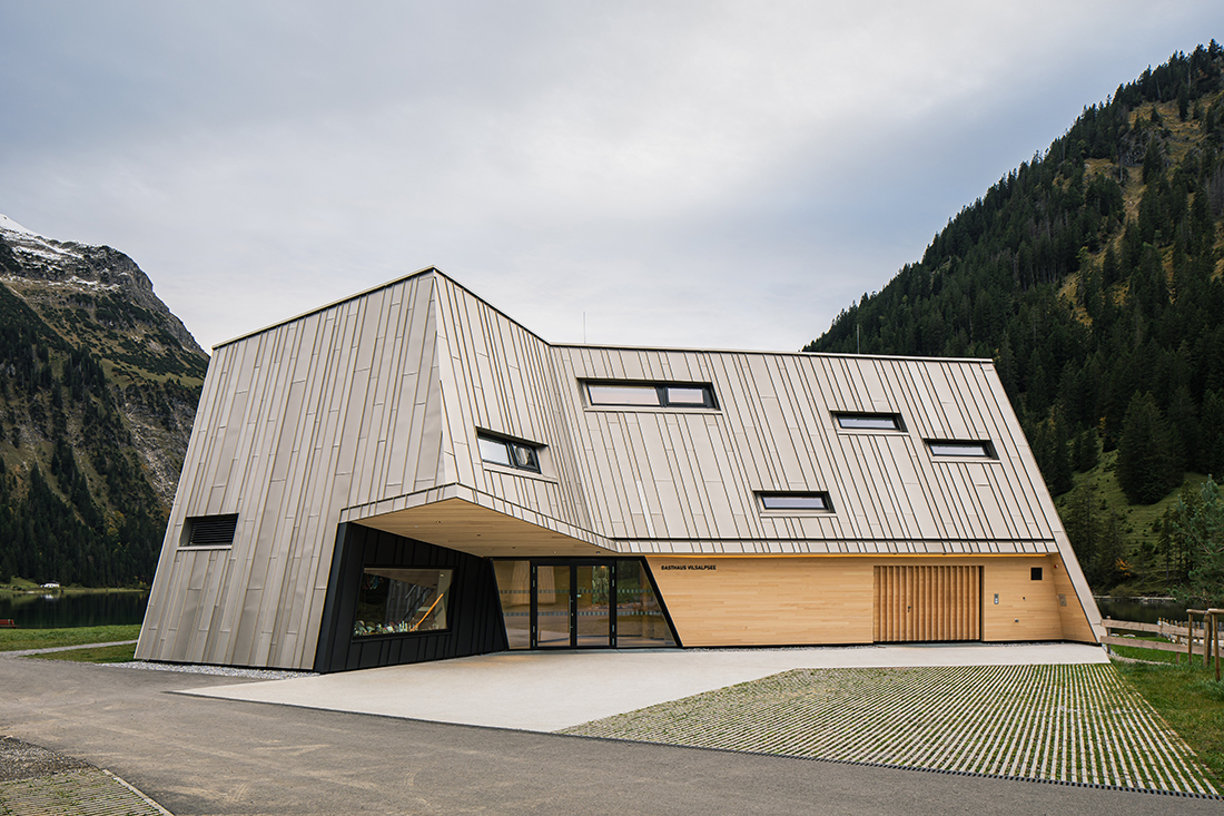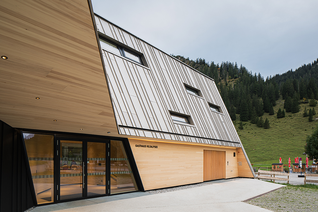 The Vilsalpsee Restaurant is surrounded by a largely untouched landscape in the middle of a nature reserve. The horizontality of the water level and the steeply rising rock formations are the defining elements that make this place so special. The building seeks to bring these apparent opposites into a symbiotic relationship.