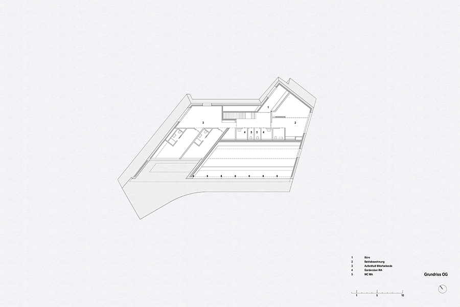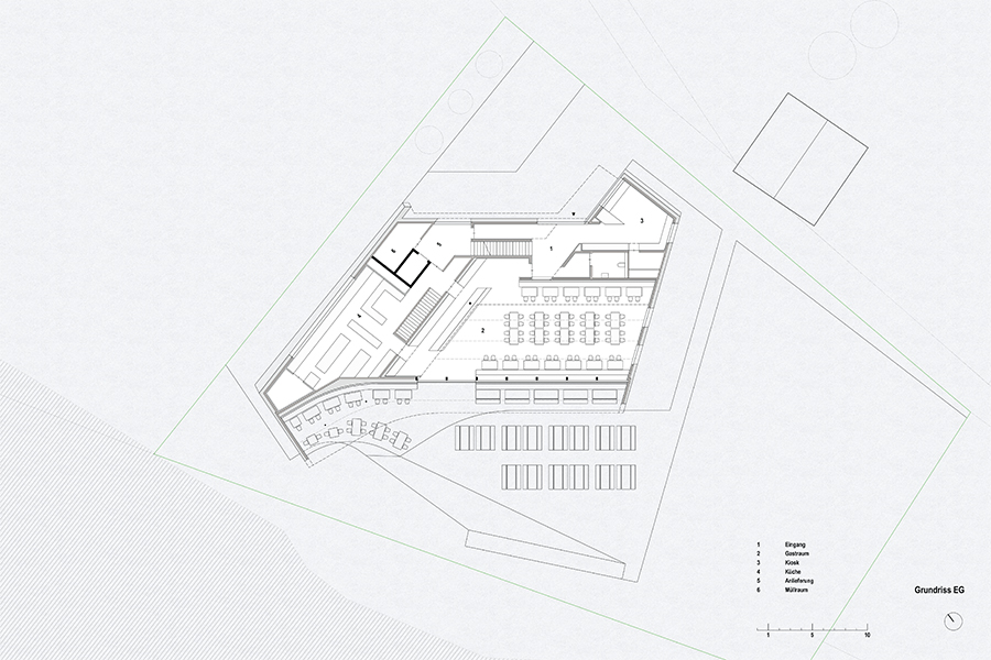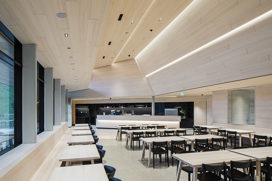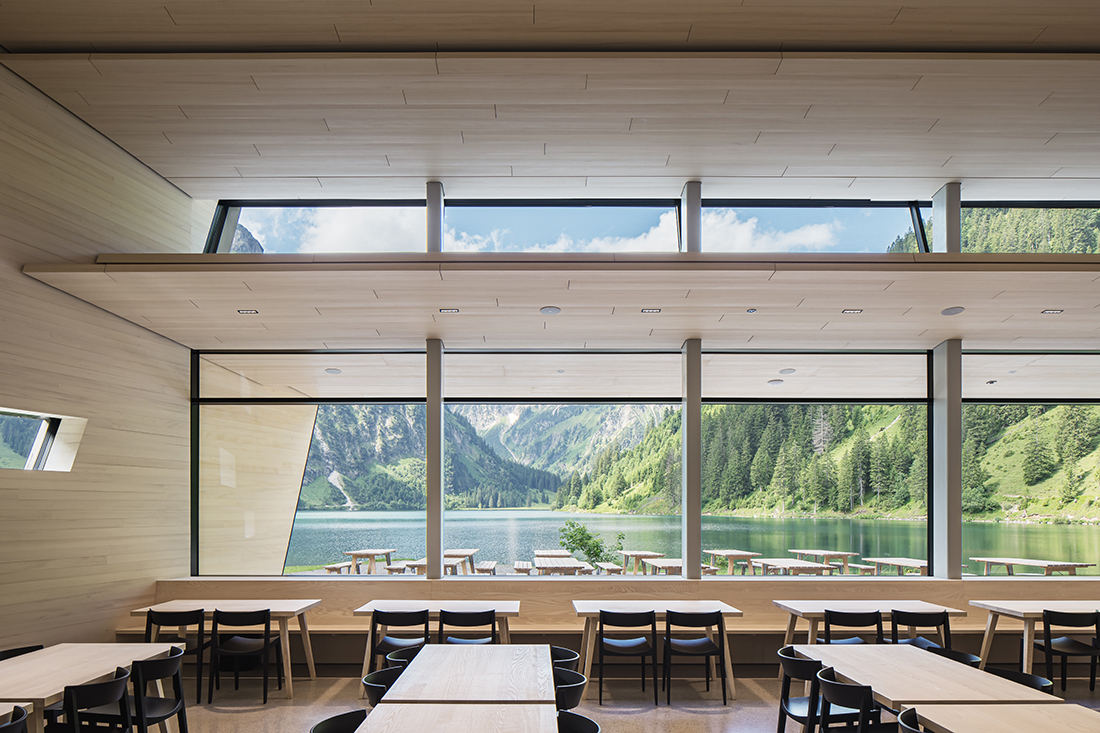The approach from the valley and the clear orientation of the dining hall – positioned as the main space facing the lake – establish two distinct edges. At the same time, two different outdoor spaces are created: a forecourt with a kiosk and covered entrance, and an expansive lake terrace. The glazed façade of the dining room is positioned at a right angle to the lake’s longitudinal axis, allowing the water surface to be experienced in its full extent within the mountain landscape. Additionally, a skylight offers a view of the surrounding mountain peaks.