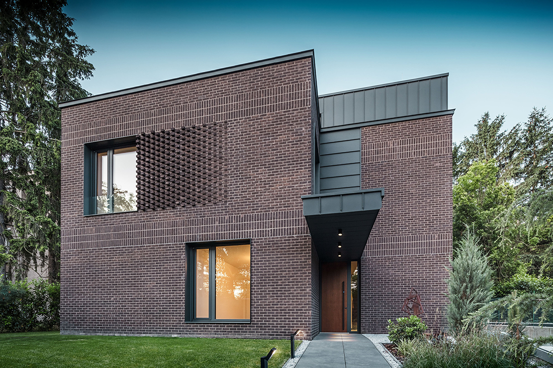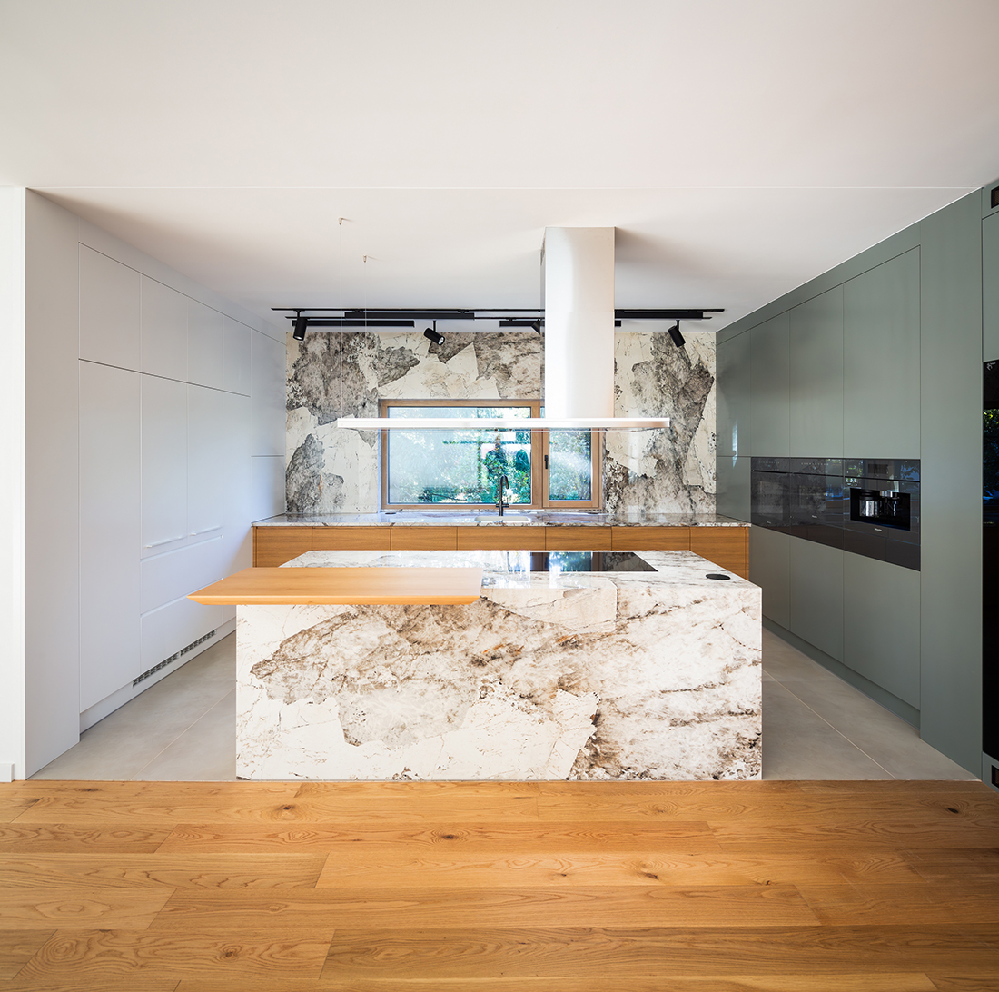 The modern brick façade, featuring an intricate perforated design, offers timeless elegance and adds a distinctive character to the architectural landscape. The expansive openings and transitional spaces open towards the garden, blending the greenery with the interior. The house offers opportunities for various lifestyles. The separation of the two apartments allows for the building to serve as a high-quality, luxury residence for two separate families, while also offering an ideal setting for a multi-generational family model.