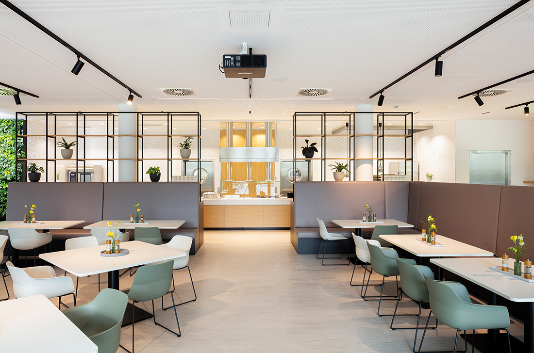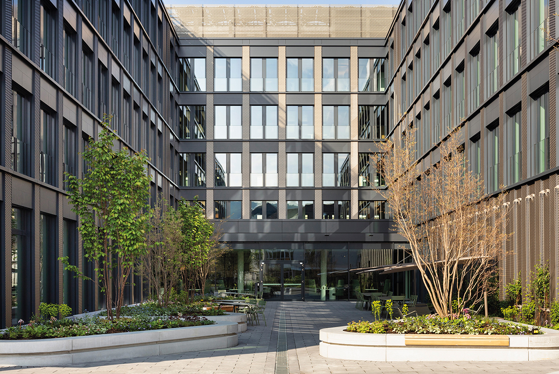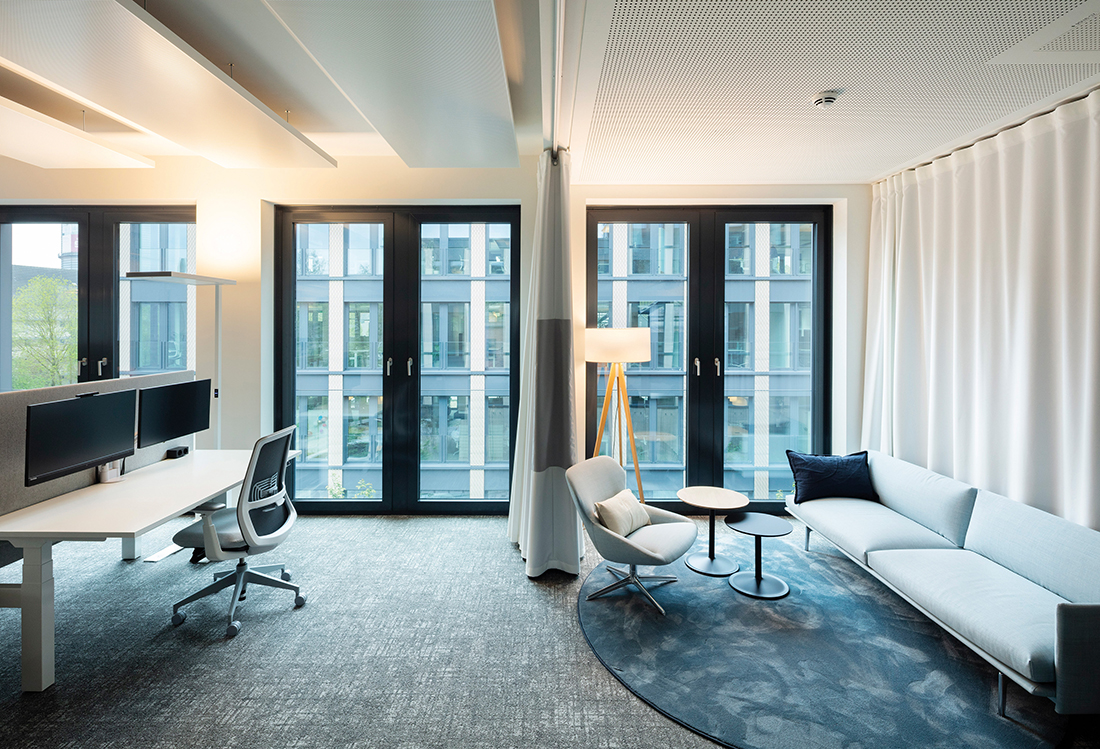 Inside, it offers office space, ancillary rooms, and a staff restaurant with seating for 80 guests. Innovative room layouts, natural ventilation, and acoustically effective ceiling sails contribute to a pleasant indoor climate and enhance employee well-being. Aesthetically, the elegant façade made of champagne-colored expanded metal merges form and function. The U-shaped structure fosters a harmonious connection to nature, while green seating areas and an inner courtyard provide space for relaxation and interaction. In recognition of its commitment to sustainability, the building has received DGNB (German Sustainable Building Council) Platinum certification.