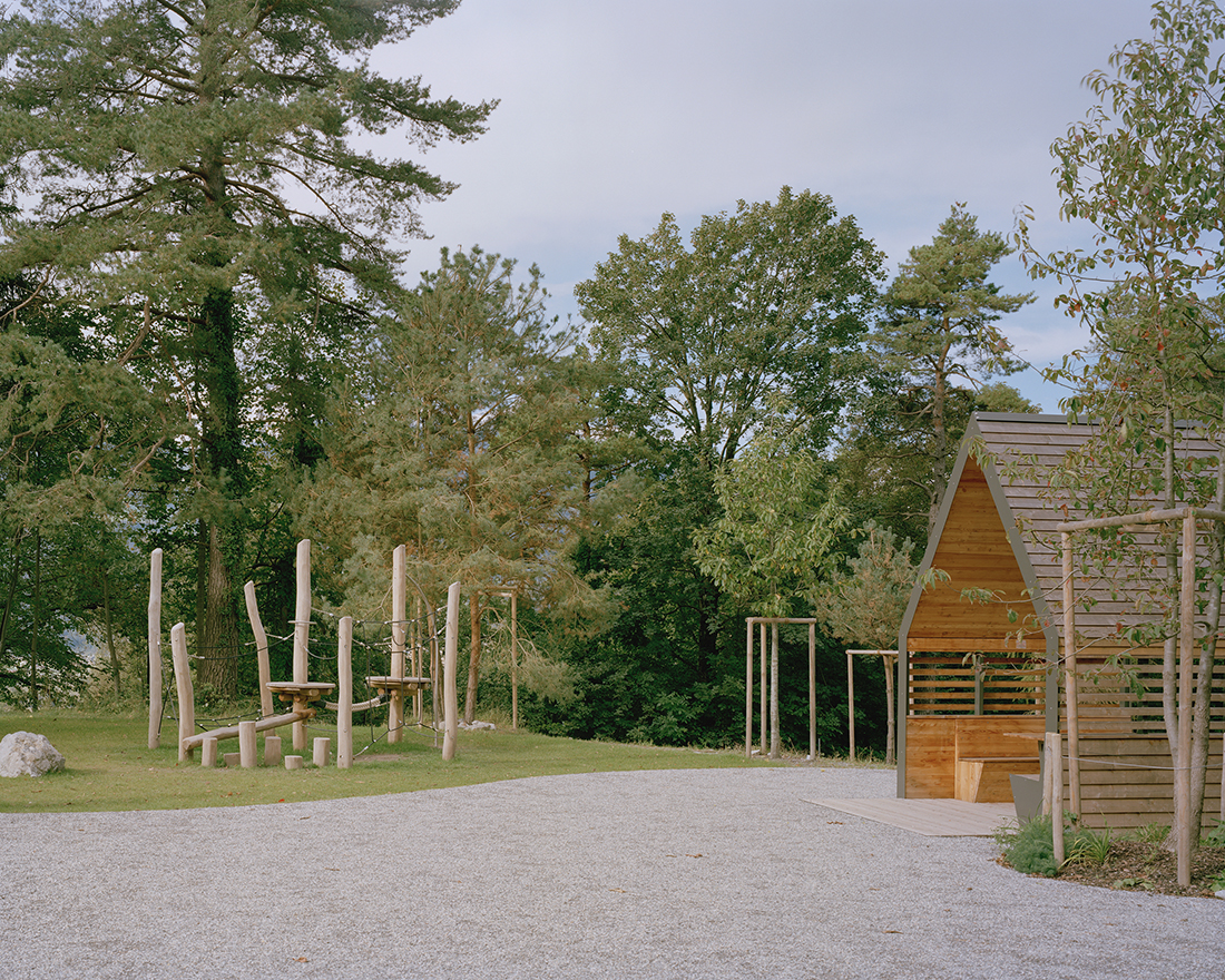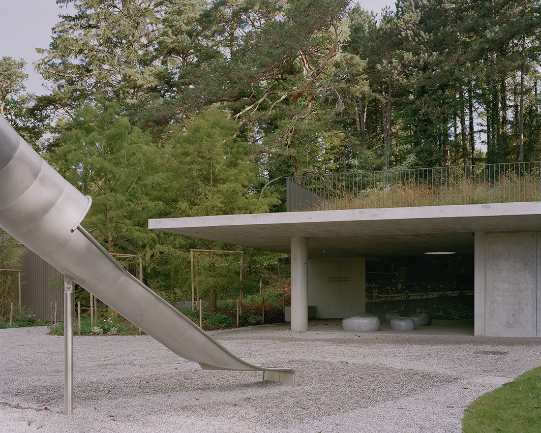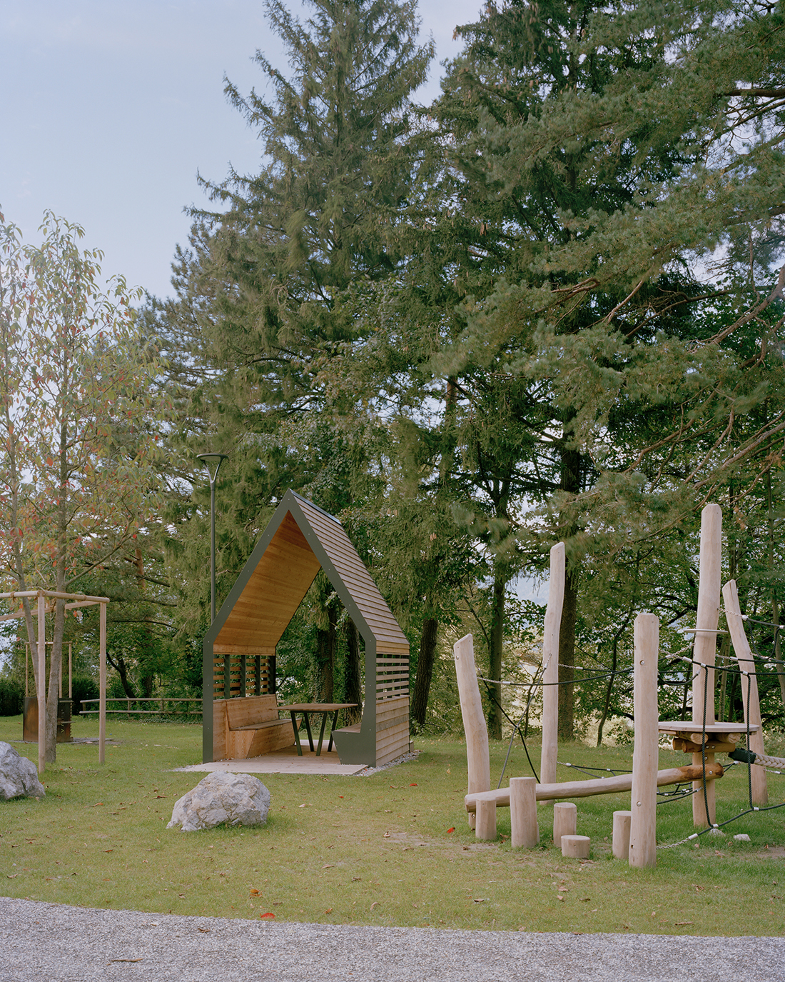 The preservation of old trees provides natural shade and biodiversity, while offering a peaceful environment for visitors. The park is designed as an inclusive and multifunctional space, featuring shaded seating areas, barbecue spots, open meadows, and an accessible network of paths for walking and recreation. The historic Waldhotel cellar has been restored and reimagined as an inviting gathering place to strengthen the connection to the site’s history.
