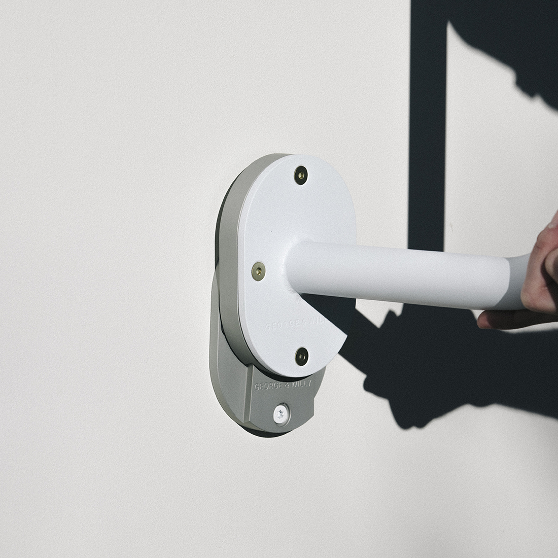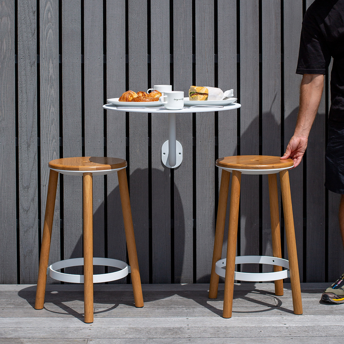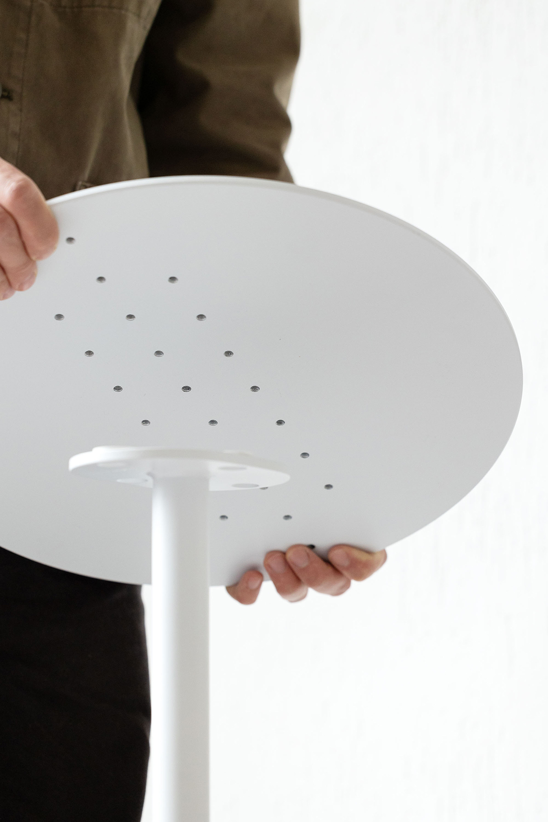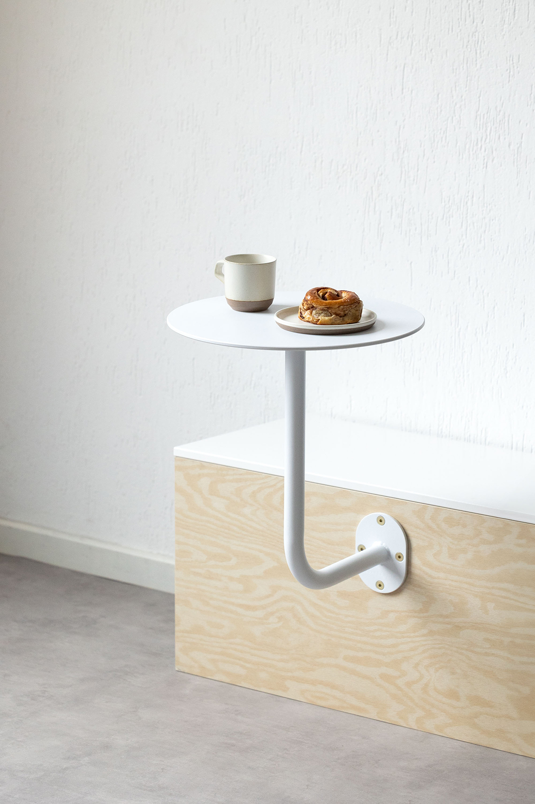 A slim, zinc-coated steel bracket is mounted to the wall, while the aluminum table slots in and out of it. This means the table can be put up or taken down in seconds – useful for cleaning, closing, or freeing up space when needed. It removes the need for folding parts and keeps the overall form clean and straightforward. The mount of the table is reversible, allowing for two mounting options – and therefore, two table heights – using the same parts. The L-shaped mounting pole can be flipped to change the orientation, adjusting both the height and how far the table sits from the wall.