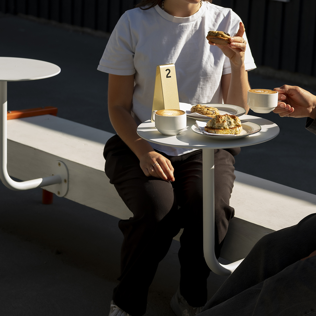 Available in two sizes, the table is lightweight but stable. Aluminum and zinc-coated steel were chosen for their durability and resistance to corrosion, making it suitable for both indoor and outdoor use. Rather than being fixed in place, the design considers how the table is used over time – installed, removed, and reinstalled – offering a practical response to the changing needs of hospitality spaces.