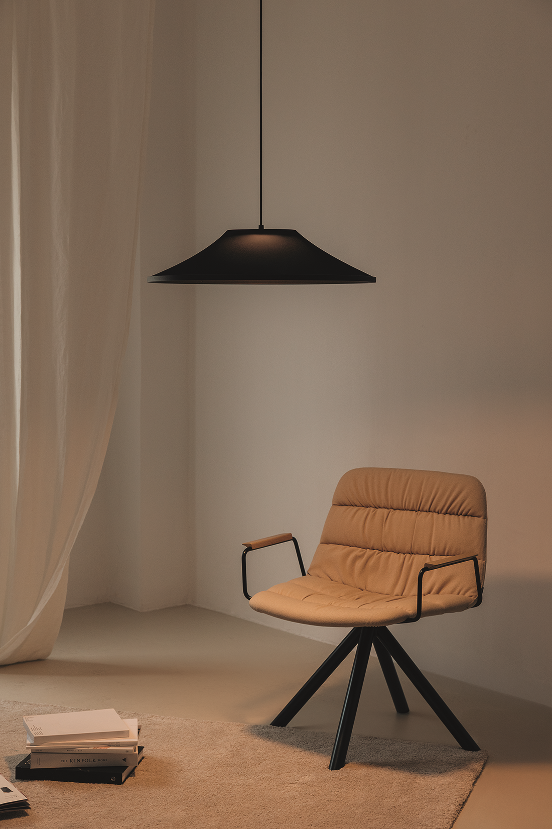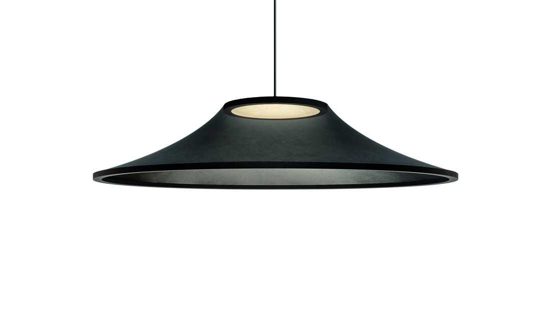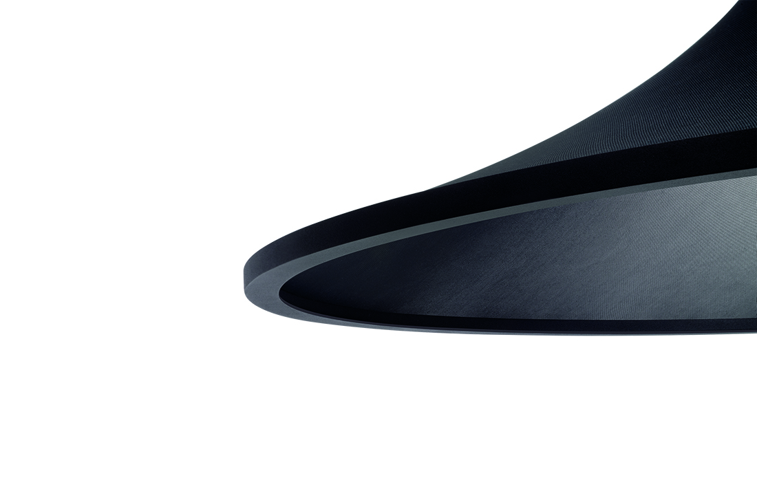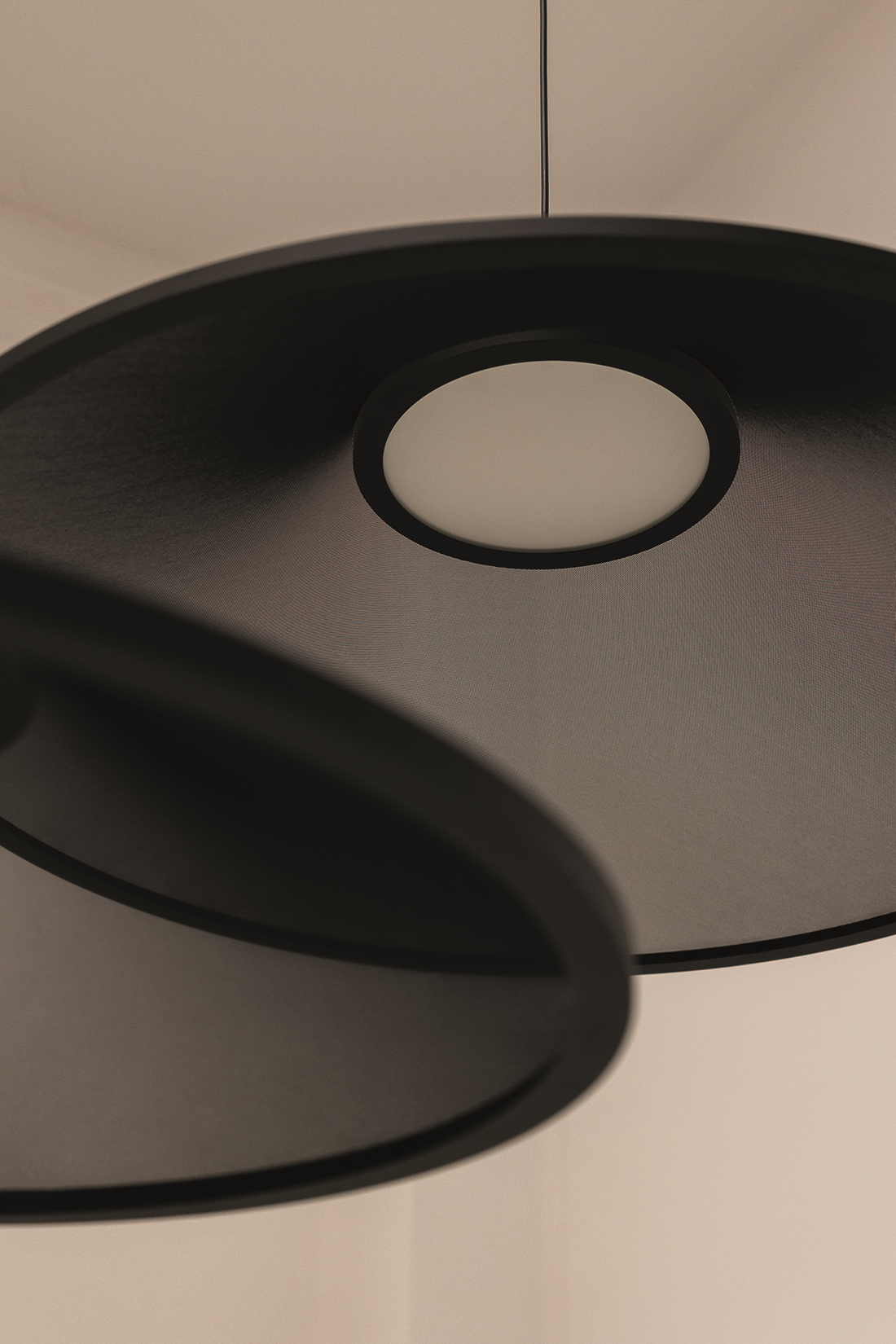 Warp emerges from a circumference of the horizontal plane and takes shape with true fluidity. Thanks to a translucent and elastic material such as textile, this suspension luminaire plays with the effects of translucency, offering great visual lightness and filtering the light through a defined contour. Warp has been designed by the German studio Geckeler Michels.