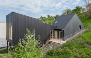 Liptov region has long been a popular recreational location. The long and narrow plot has a favourable east-west orientation, but on its southern (most precious) border, sits a neighbouring house with its windows directly overlooking it. We choose the welltried open concept of an atrium house, which provides the inhabitants with the benefit of the southern sun, and at the same time sorts out the exposed social interaction with the outside world. The atrium house is divided into three wings that wrap up around the atrium. The eastern wing comprises the entrance + carport with storage for sports equipment. The northern wing houses the main living area with an open gable roof. Bedrooms with an adjacent outdoor patio are situated in the western wing. The southern side of the atrium is made up of a large sliding wall, which can fully open the atrium or close it to create an intimate “inner exterior”. The overall result is simple, ground-floor, barrier-free living. The calm, linear structures are augmented by the saddle roof silhouette.