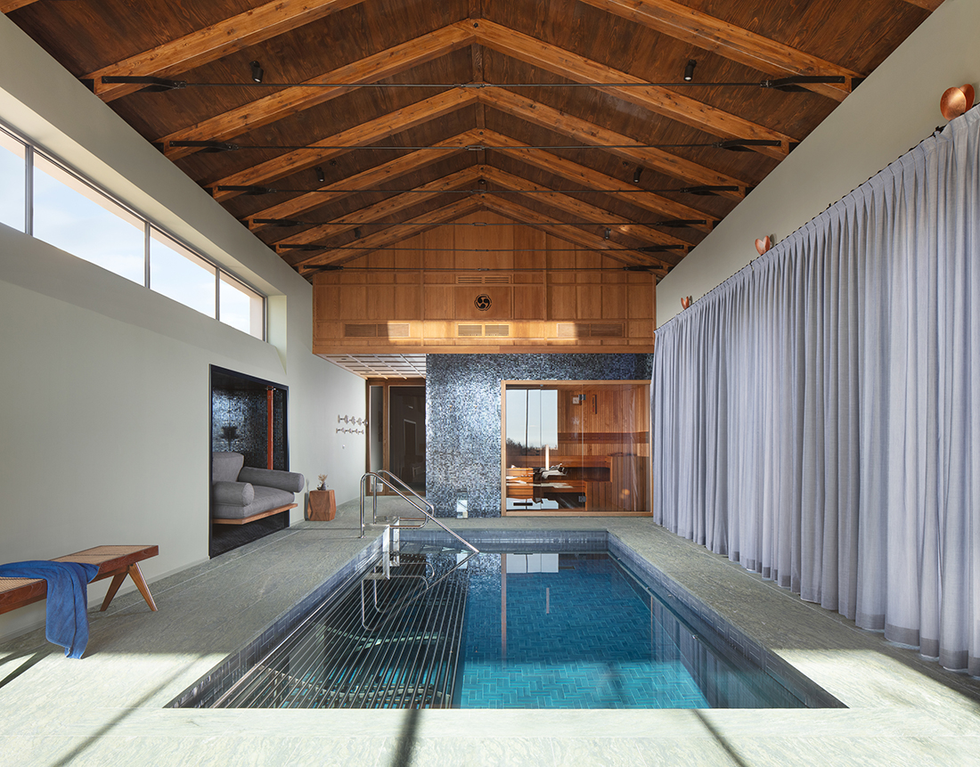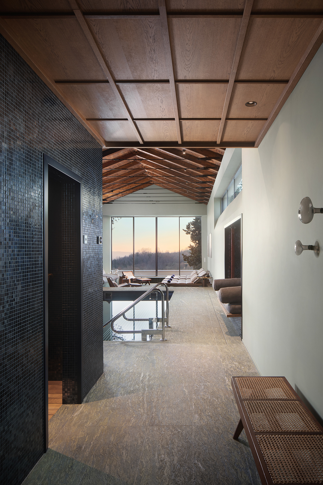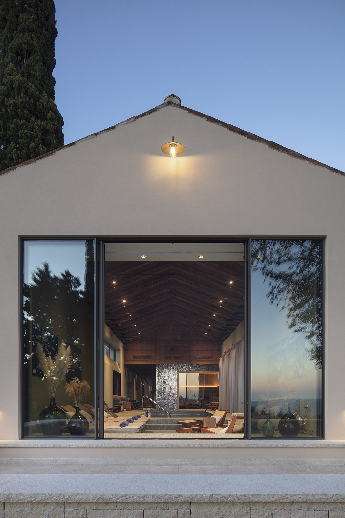 At the same time, the details of the addition are contemporary, subtly differentiating it from the existing volumes and providing a glimpse of the interior, which includes a wellness area with a pool, saunas, and a fitness room.