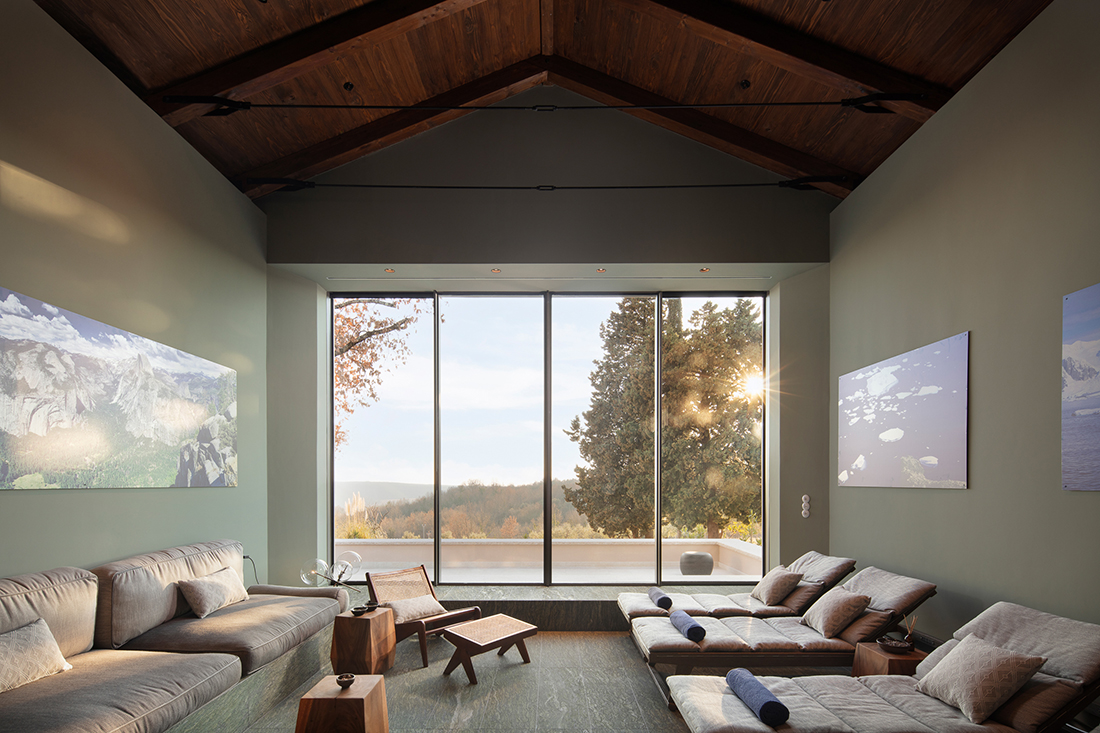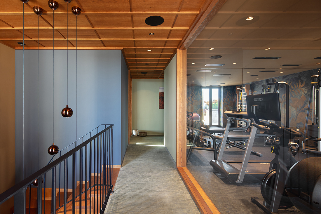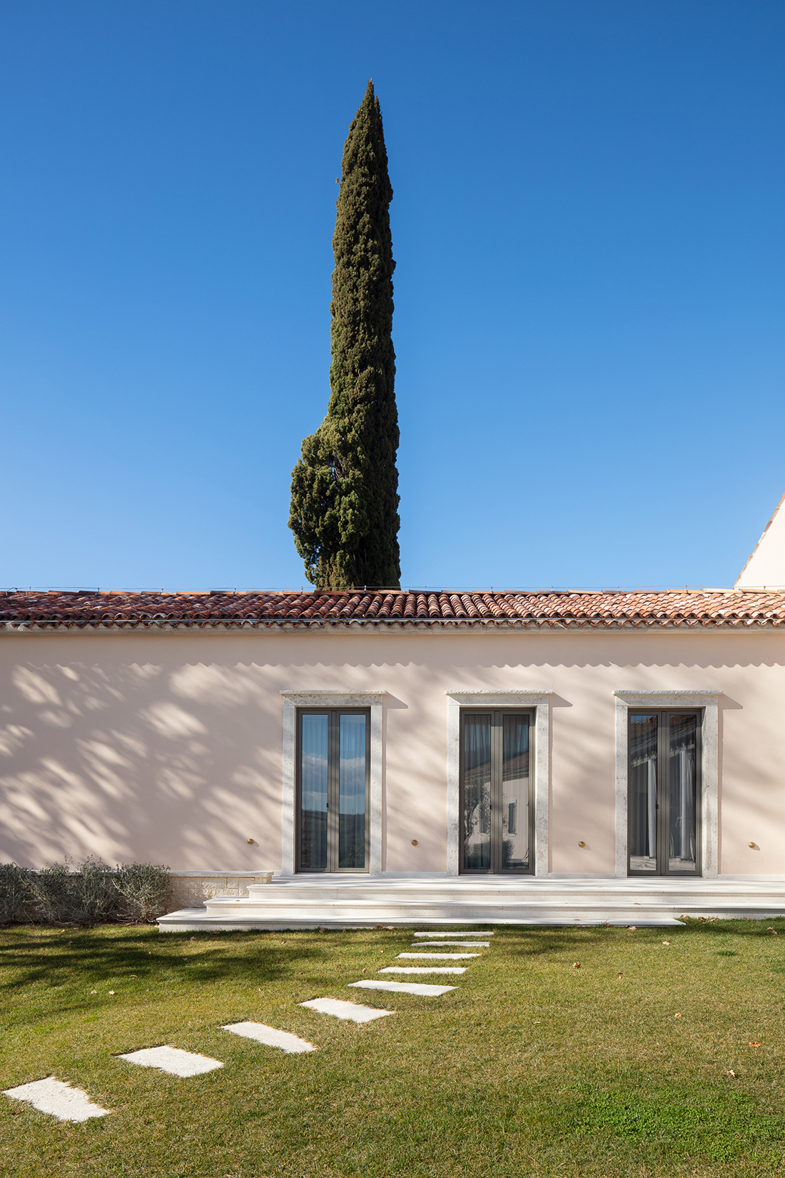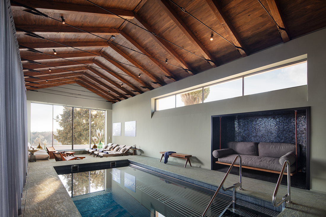 At the same time, the details of the addition are contemporary, subtly differentiating it from the existing volumes and providing a glimpse of the interior, which includes a wellness area with a pool, saunas, and a fitness room.