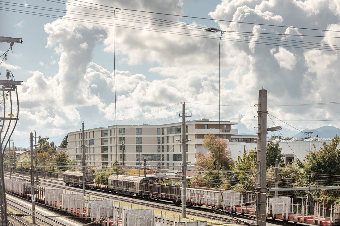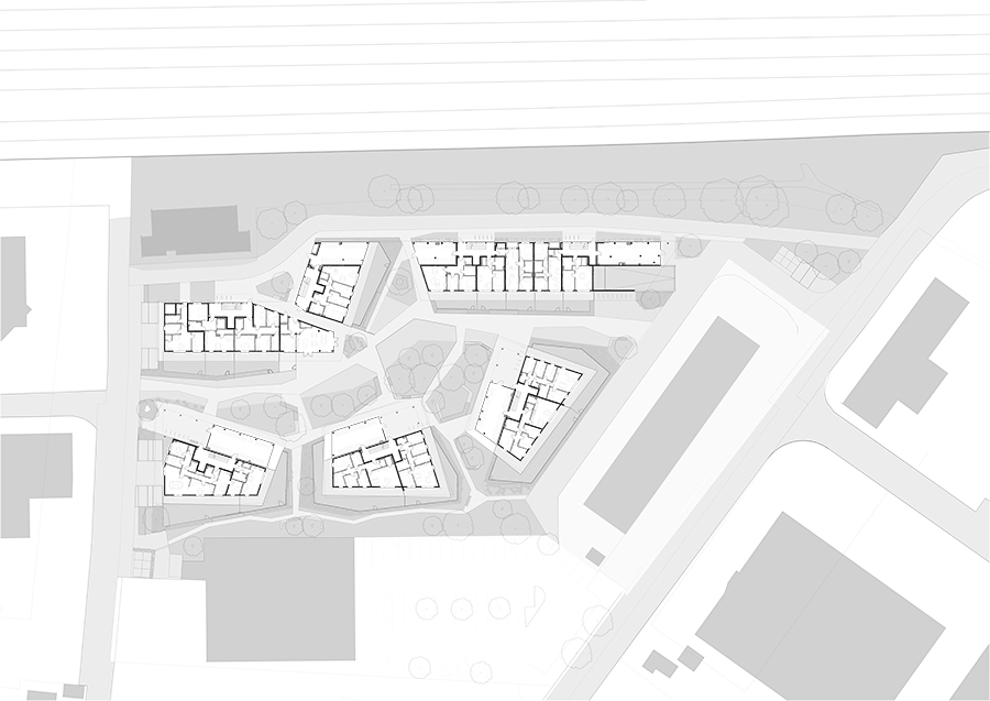 The development responds sensitively to the site’s configuration, nestling thoughtfully among existing structures and engaging with the surrounding public spaces. A linear volume strategically shields the residences from railway noise, while a deliberate break in the building mass creates a proportionate dialogue with neighboring architecture.