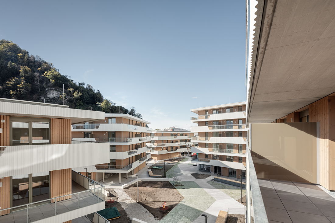 Scattered volumes across the neighborhood establish visual and spatial connections with their context through calibrated height and careful placement. This composition fosters a calm, cohesive atmosphere and frames axial views that lead the eye toward the mountain landscape.
