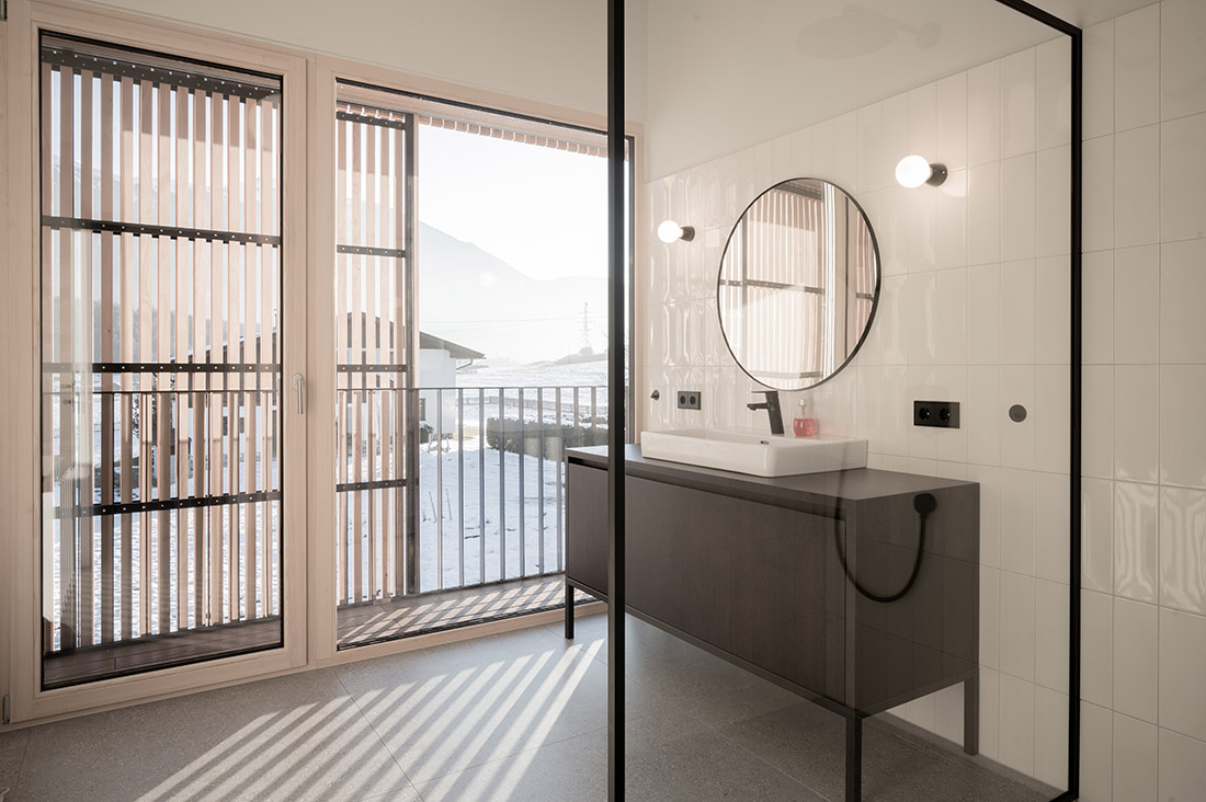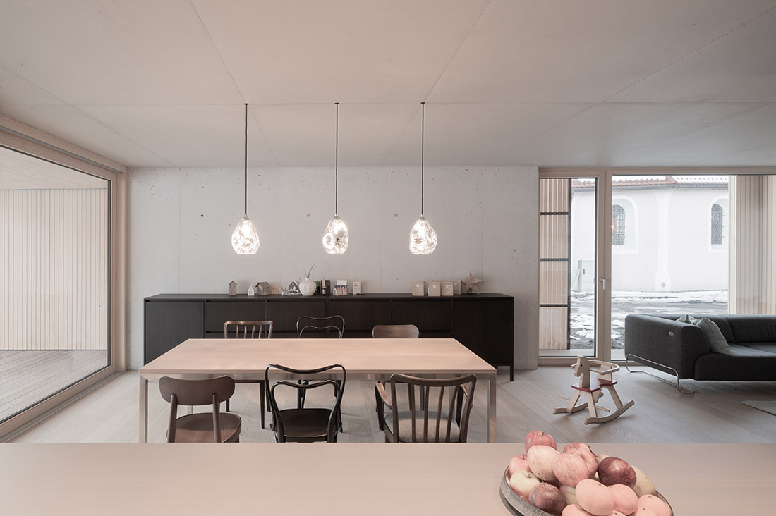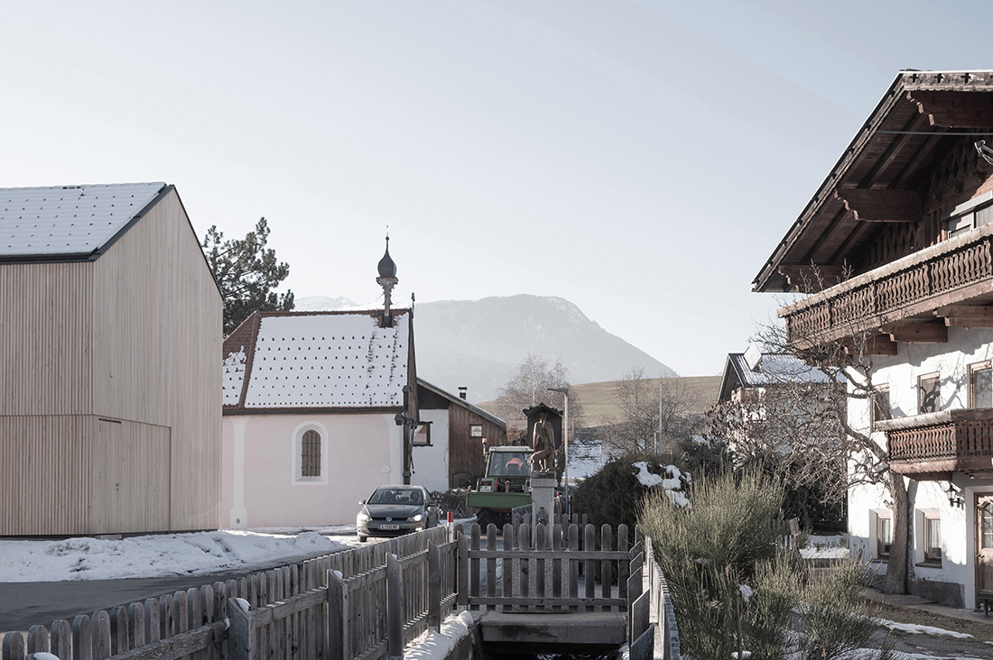 In the immediate vicinity of the 400-year-old Baroque Chapel in Mieming stands the residential house. To benefit from the wonderful views and respond to the local situation, the volume of the house was designed to be compact and positioned slightly set back from the road. The simple longitudinal structure with a pitched roof and vertically structured timber facade has a calm design, with the roof pitch and materiality corresponding to the traditional rural surroundings despite the contemporary formulation.