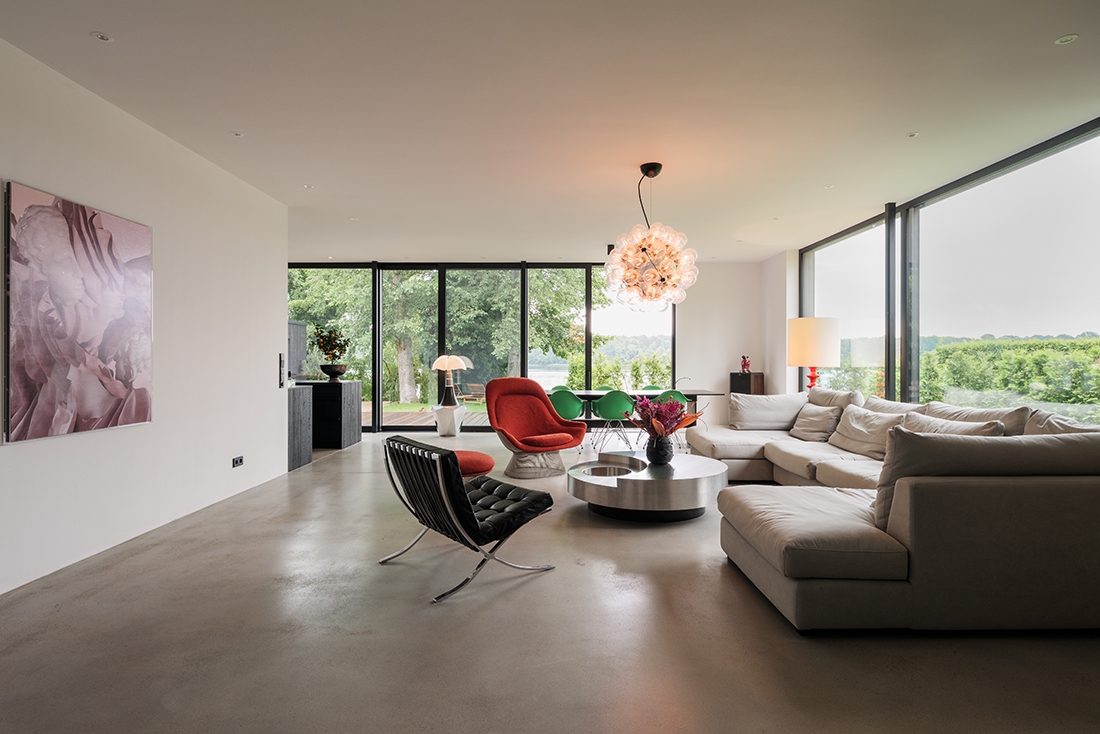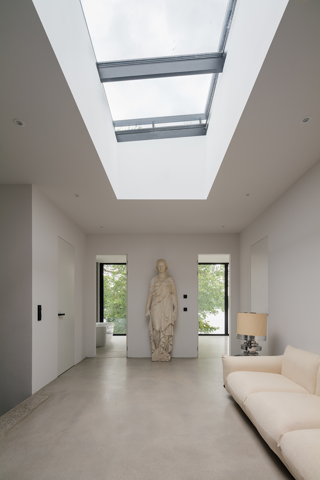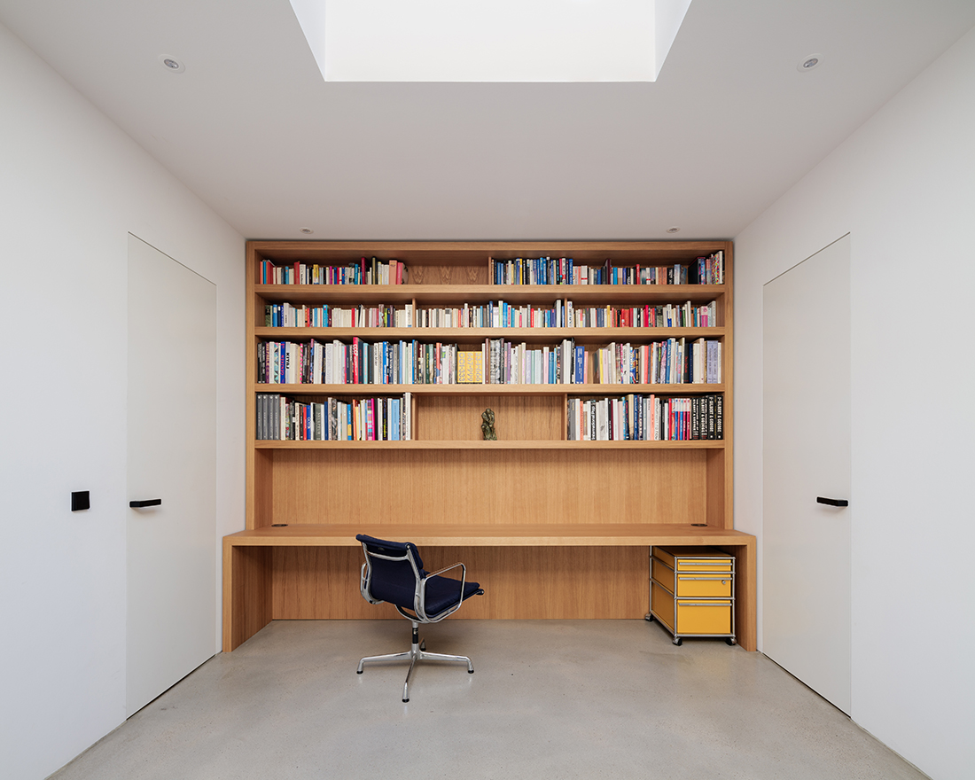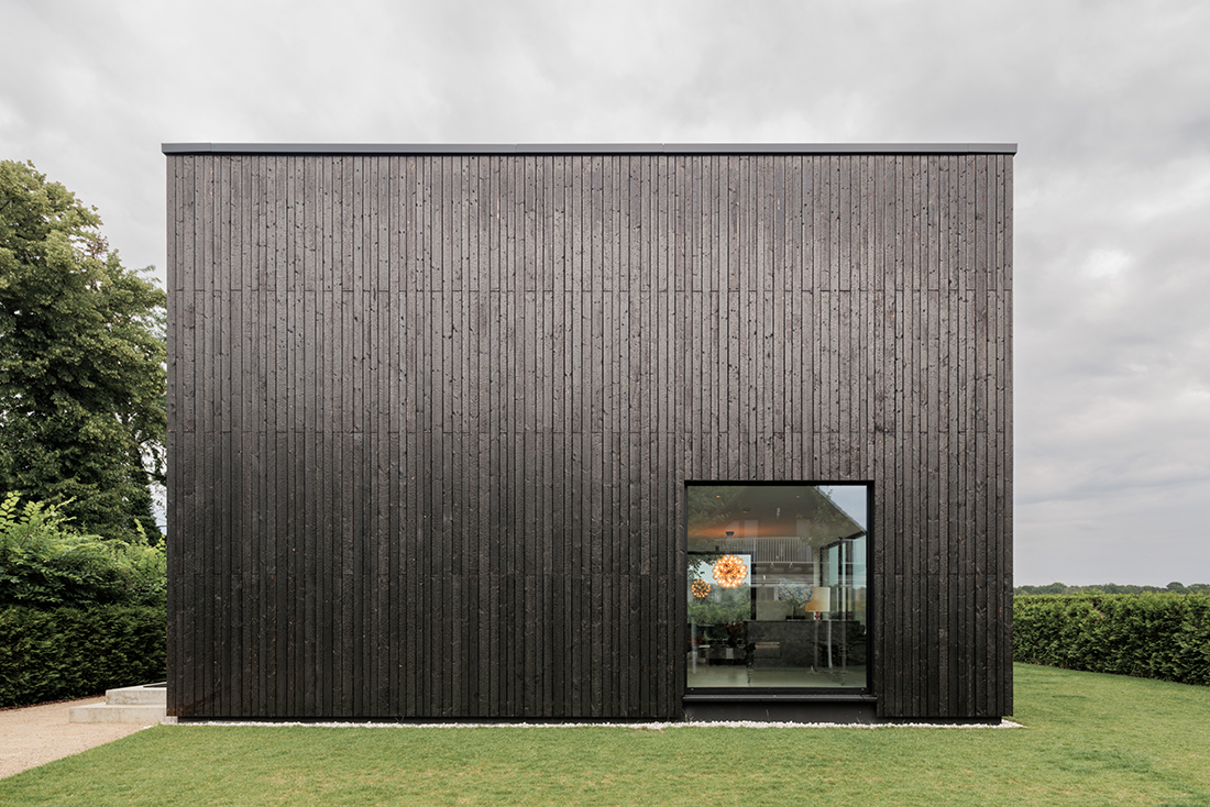 While these windows allow ample natural light to enter the interior, the garden and mature trees provide privacy. The street-facing façade is more minimalistic and closed, featuring a square window. The north side remains mostly closed, with a black entrance door and small windows hidden behind wooden slats. The simple, geometric shape of the building is accentuated by a structured wooden facade. The large windows allow for passive solar heating in winter, while external blinds provide shade in summer without blocking the view. The flat roof is equipped with a photovoltaic system, and a heat pump supplies the underfloor heating.