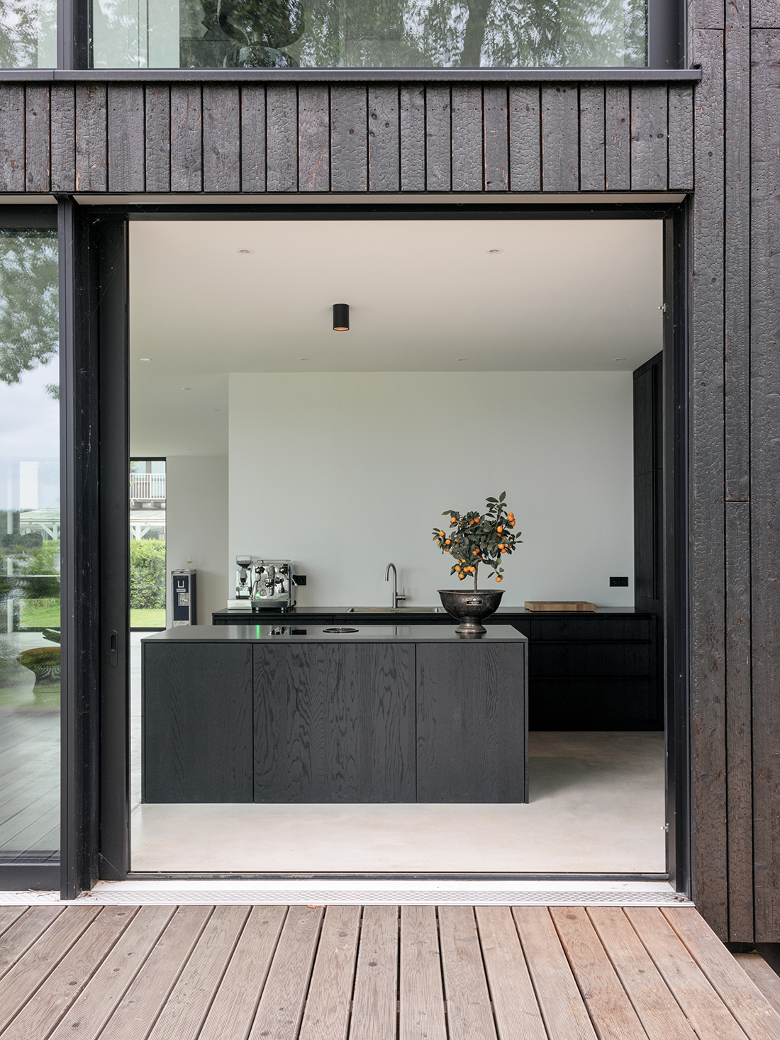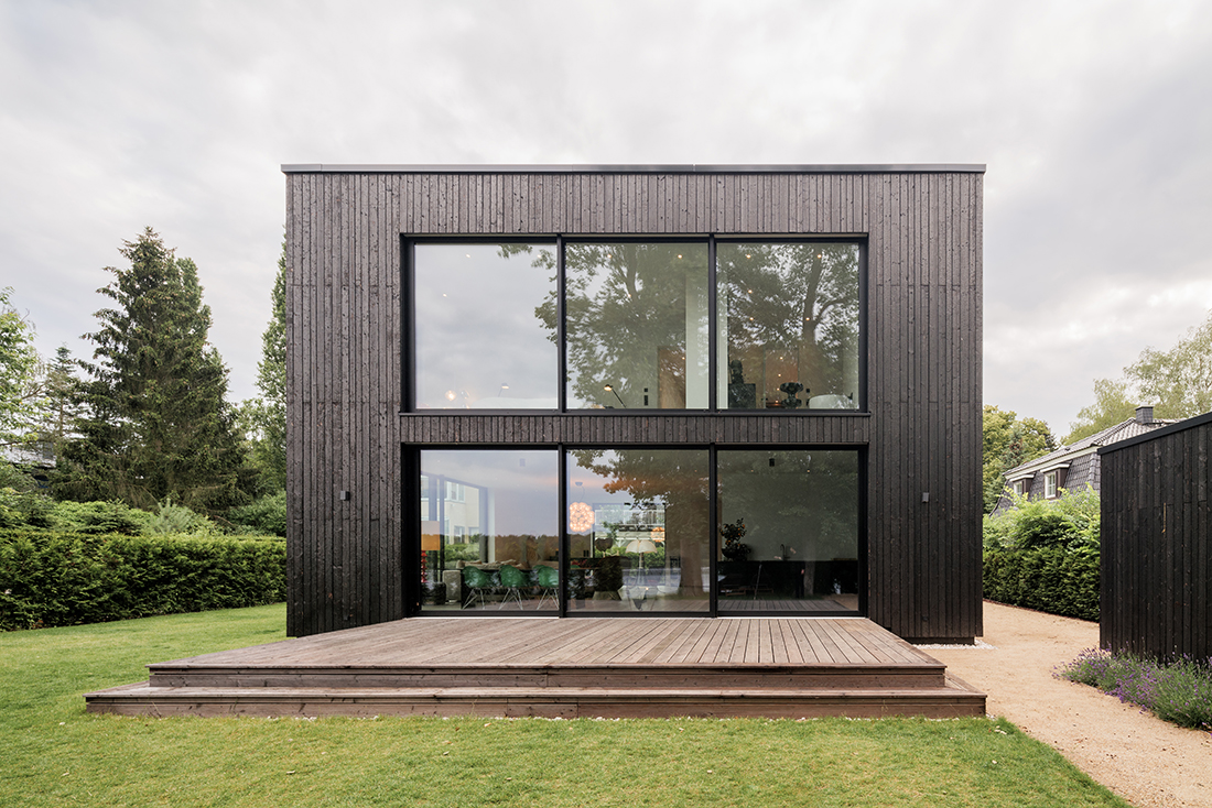 The Wooden House by the Lake is located in a historic fishing village on the outskirts of Berlin, right by the water. Its compact, black, cubic form stands out while harmonizing with nature using natural materials. Large, floor-to-ceiling windows on the east side provide an unobstructed view of the lake and surrounding trees.