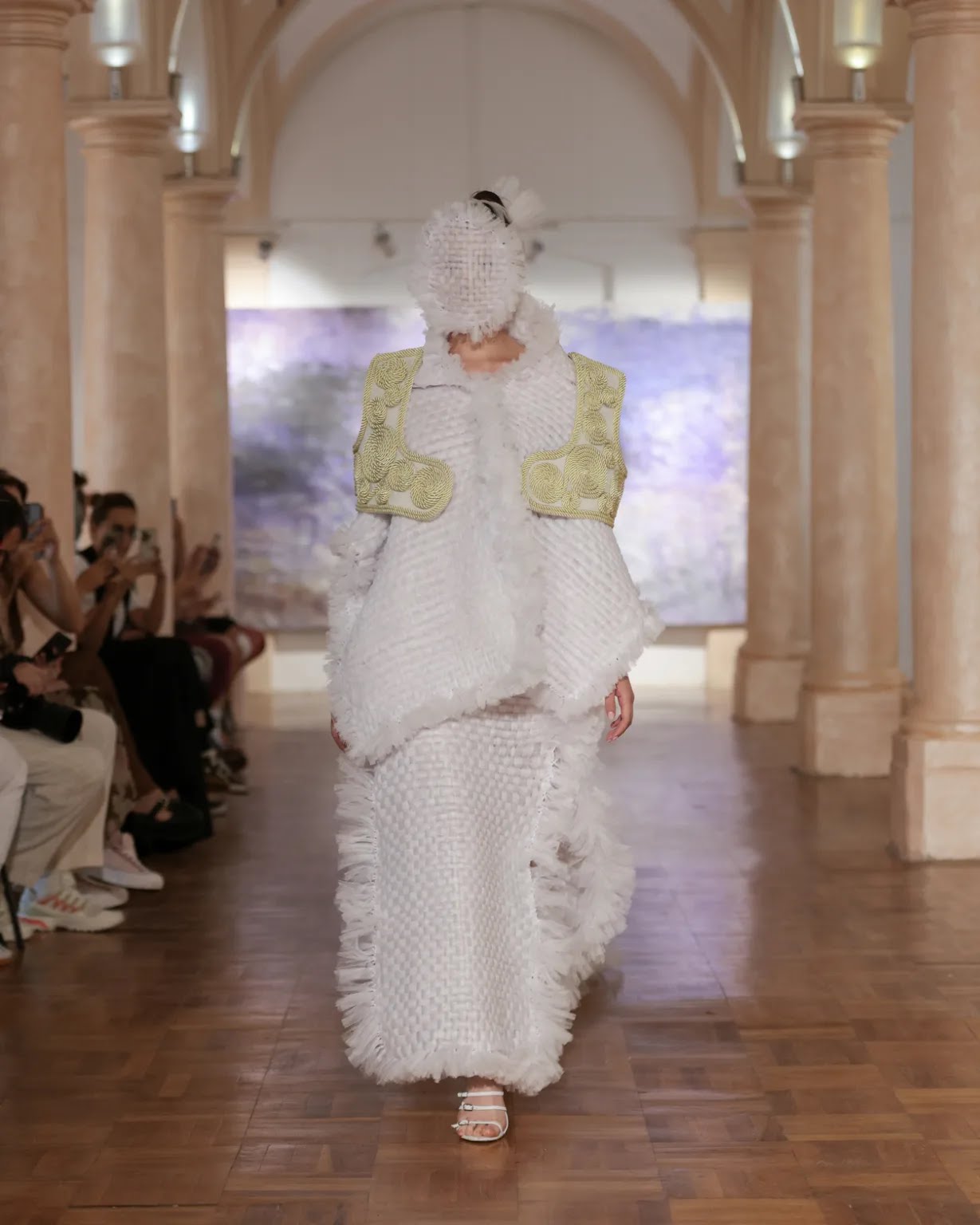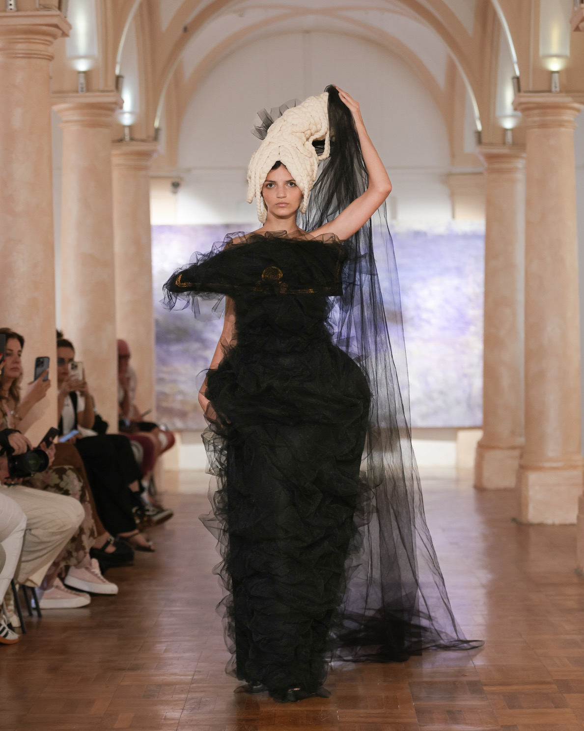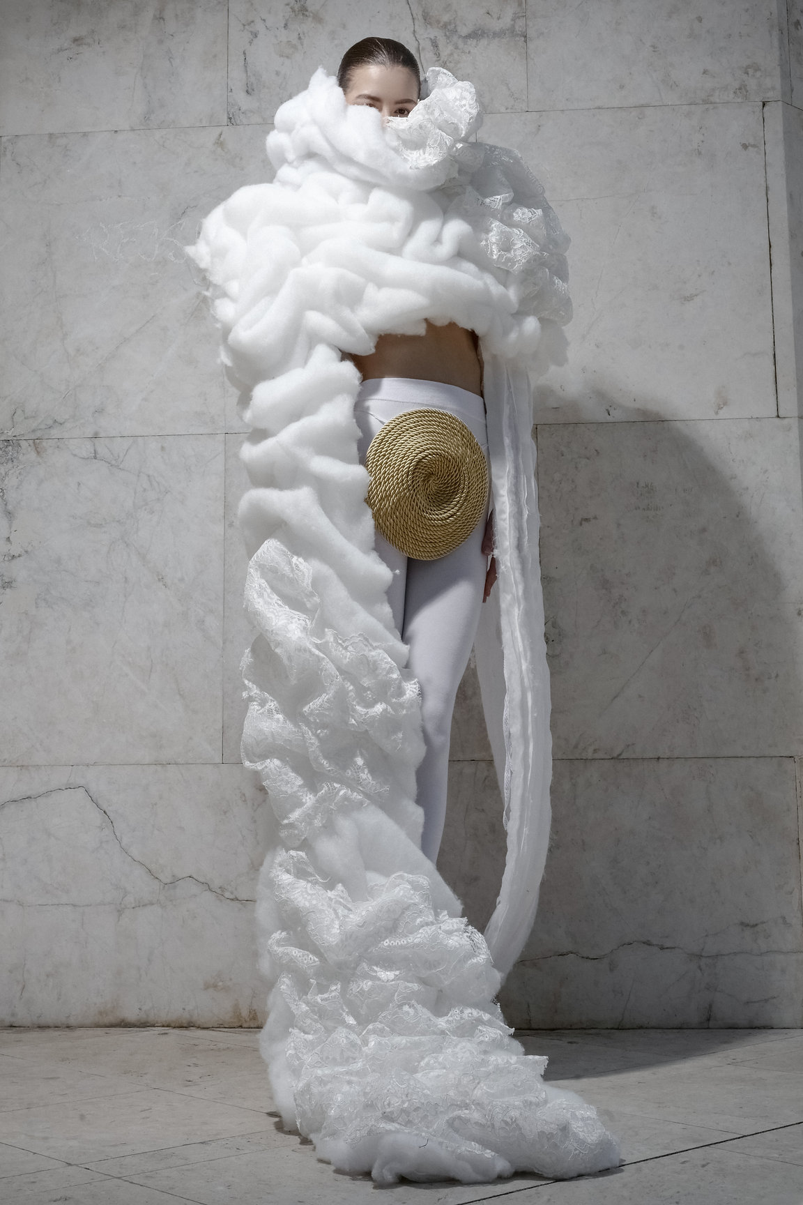 The use of tulle, woven into strips on the loom, moves delicately across the body like a fragile memory threads of time that connect and separate without breaking. Its transparency simultaneously reveals and conceals, echoing the way identity is formed between what we inherit and what we become. This material choice demonstrates not only technical competence but also conceptual clarity and emotional intelligence.