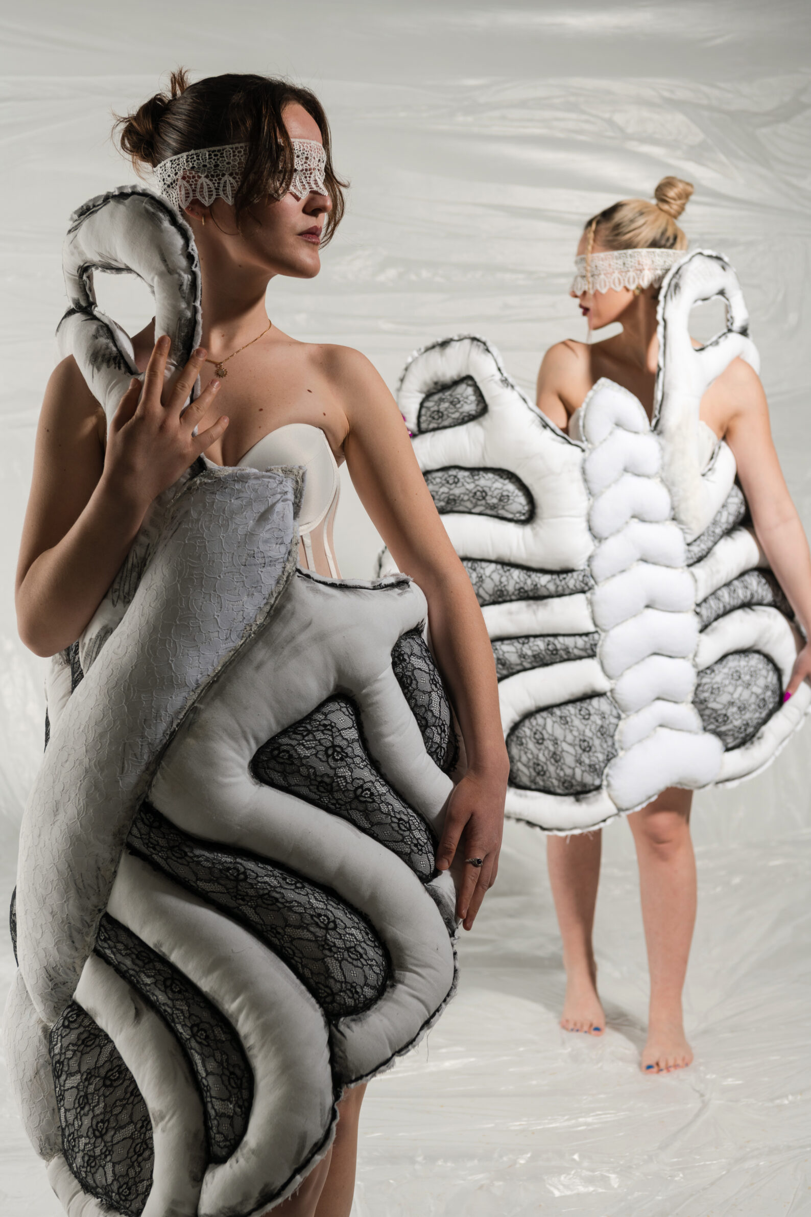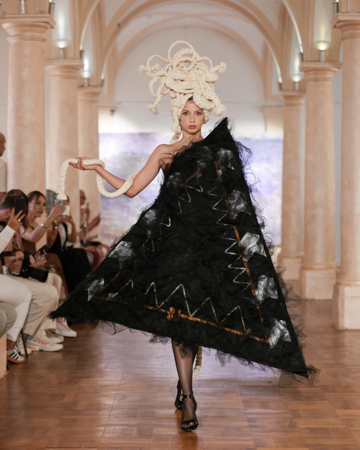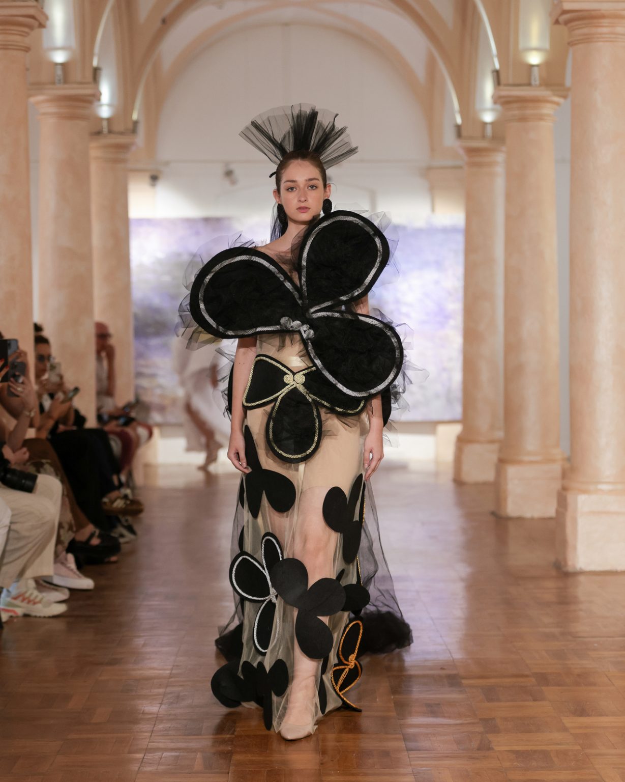 The use of tulle, woven into strips on the loom, moves delicately across the body like a fragile memory threads of time that connect and separate without breaking. Its transparency simultaneously reveals and conceals, echoing the way identity is formed between what we inherit and what we become. This material choice demonstrates not only technical competence but also conceptual clarity and emotional intelligence.