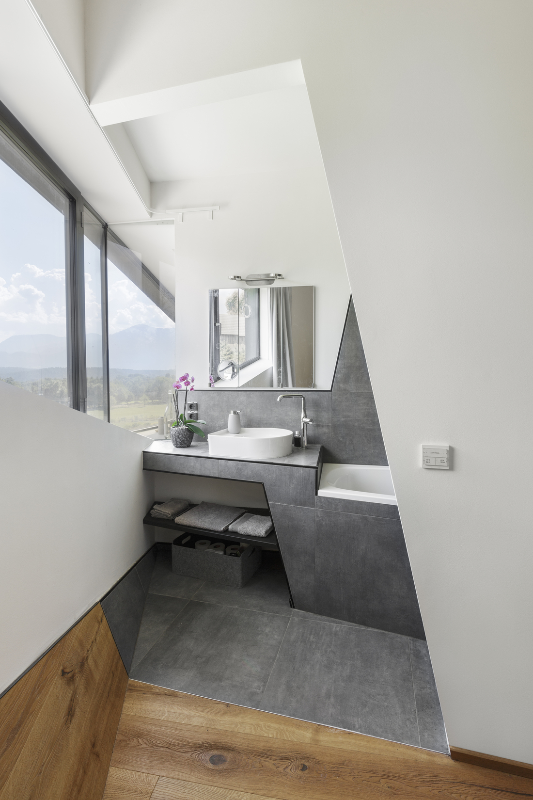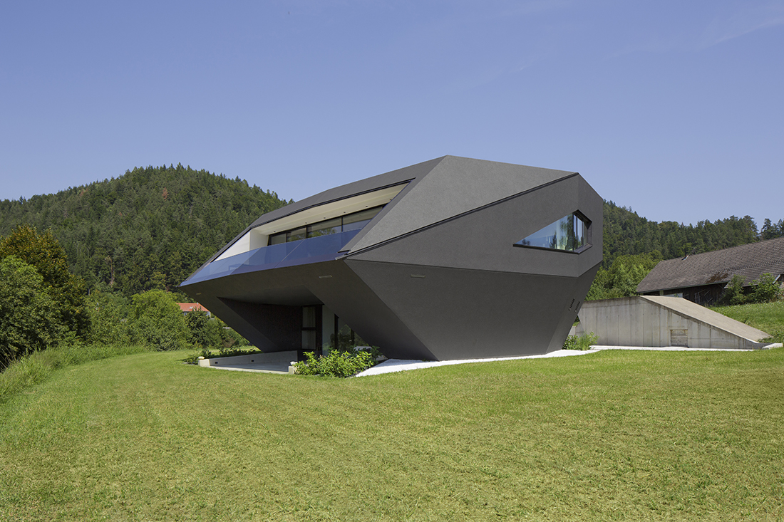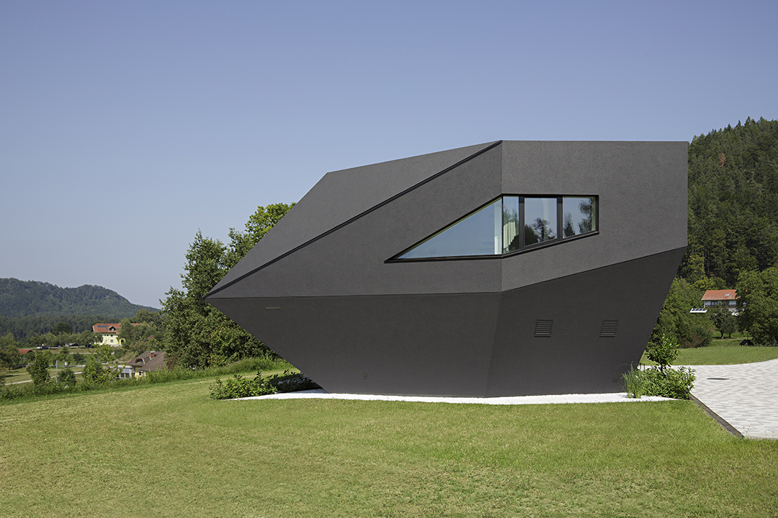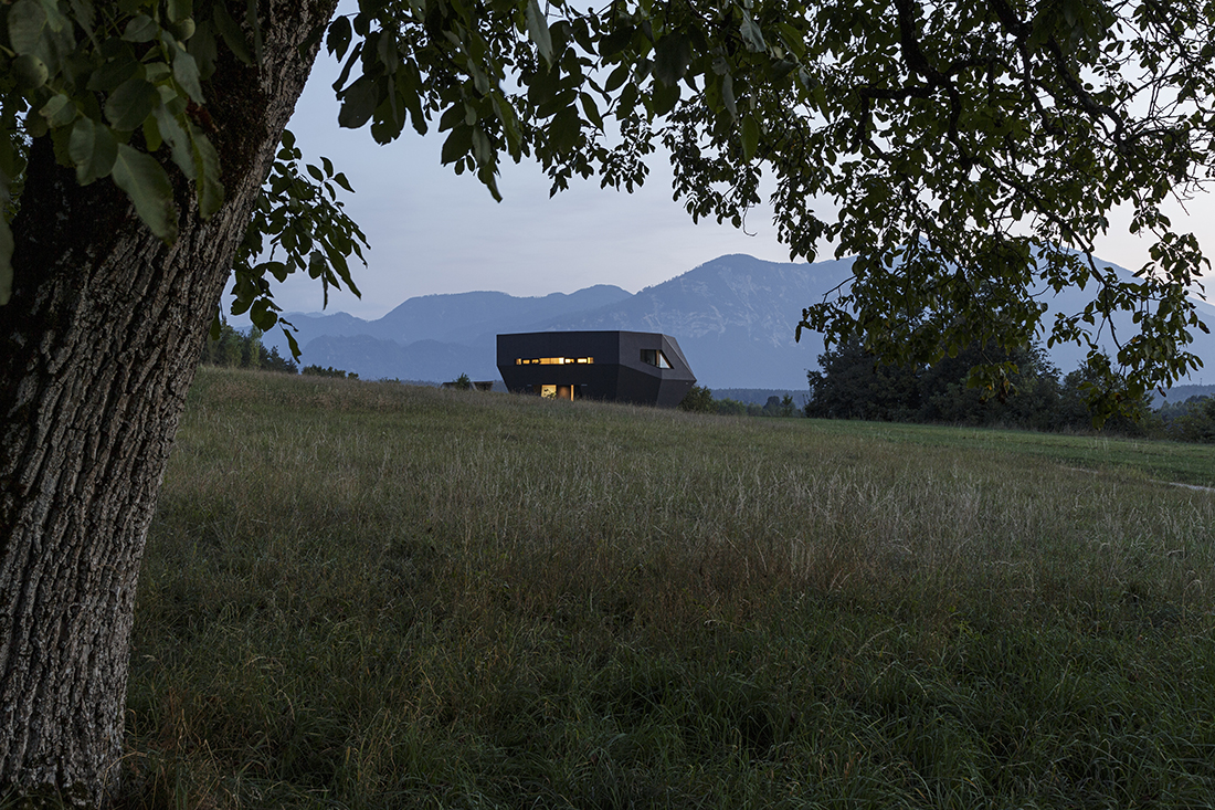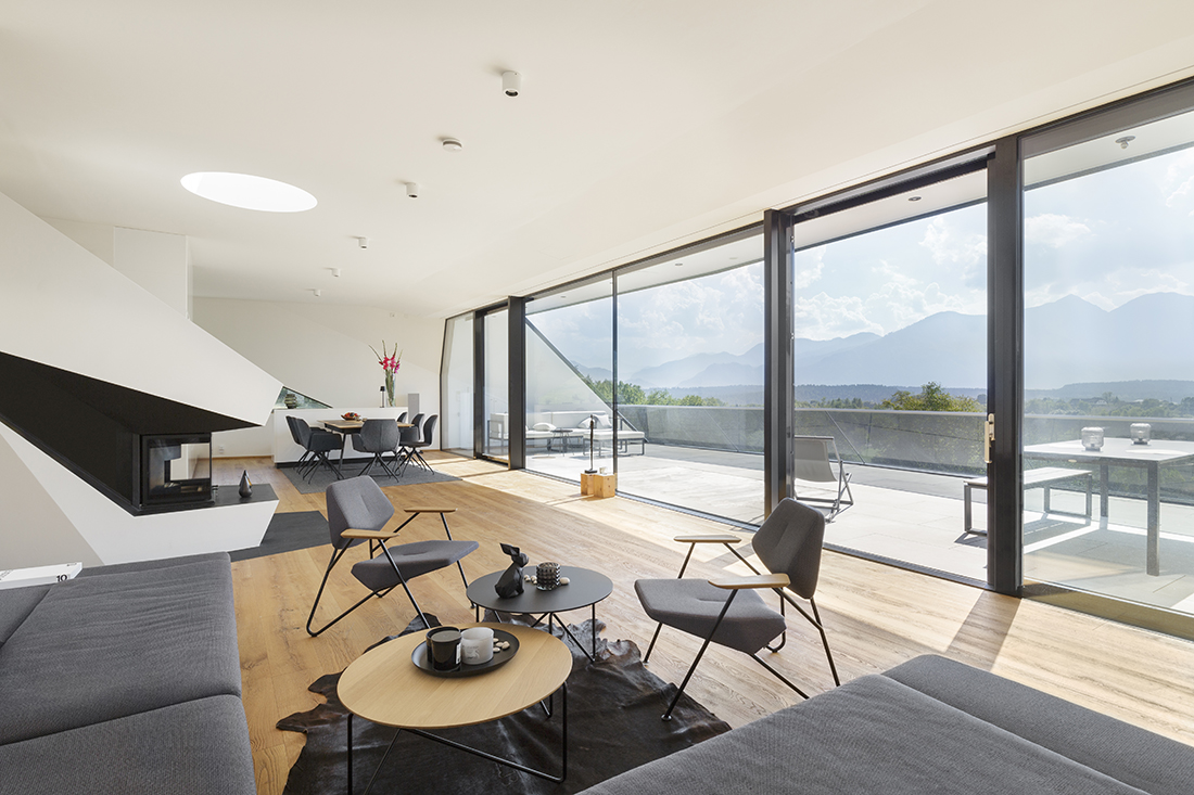 Located at the edge of a village and slightly elevated, the house opens towards the Carinthian Karawanks. A 14-metre panoramic window and a deeply cantilevered terrace align everyday life with landscape, light and seasons. The south-west orientation is inspired by the nearby landscape paintings of Werner Berg, whose calm light became a key reference.