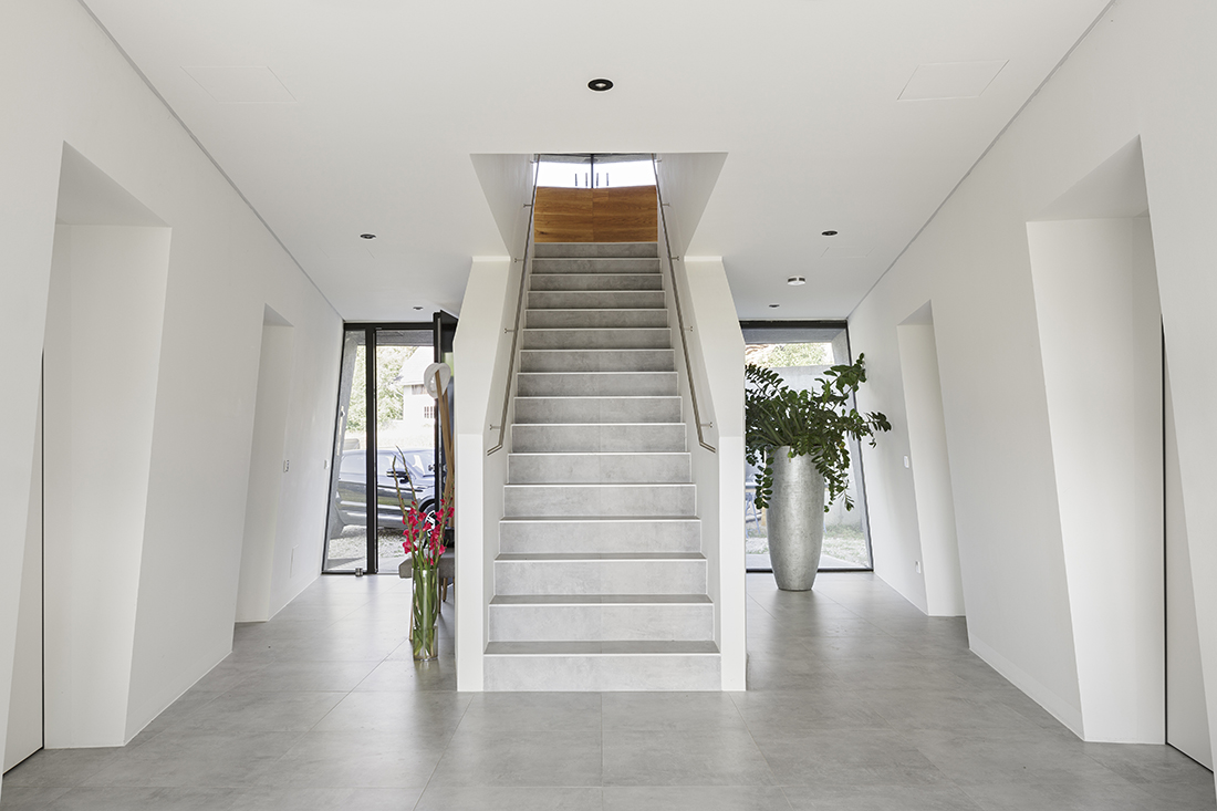 The compact, sculptural building is energetically optimised and internally ordered according to Feng Shui and Vastu. A circular staircase with an open fireplace forms the spatial core, mediating between inside and outside.