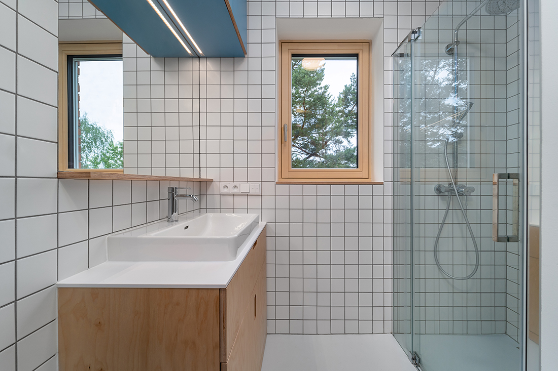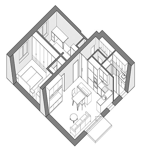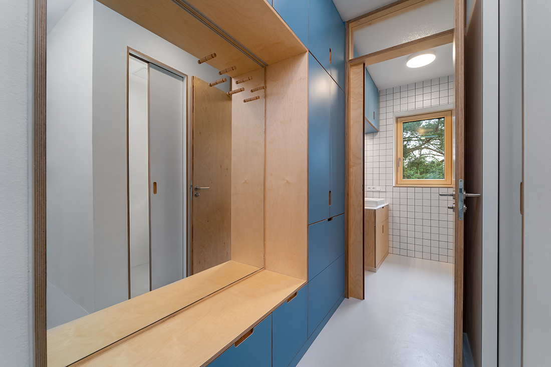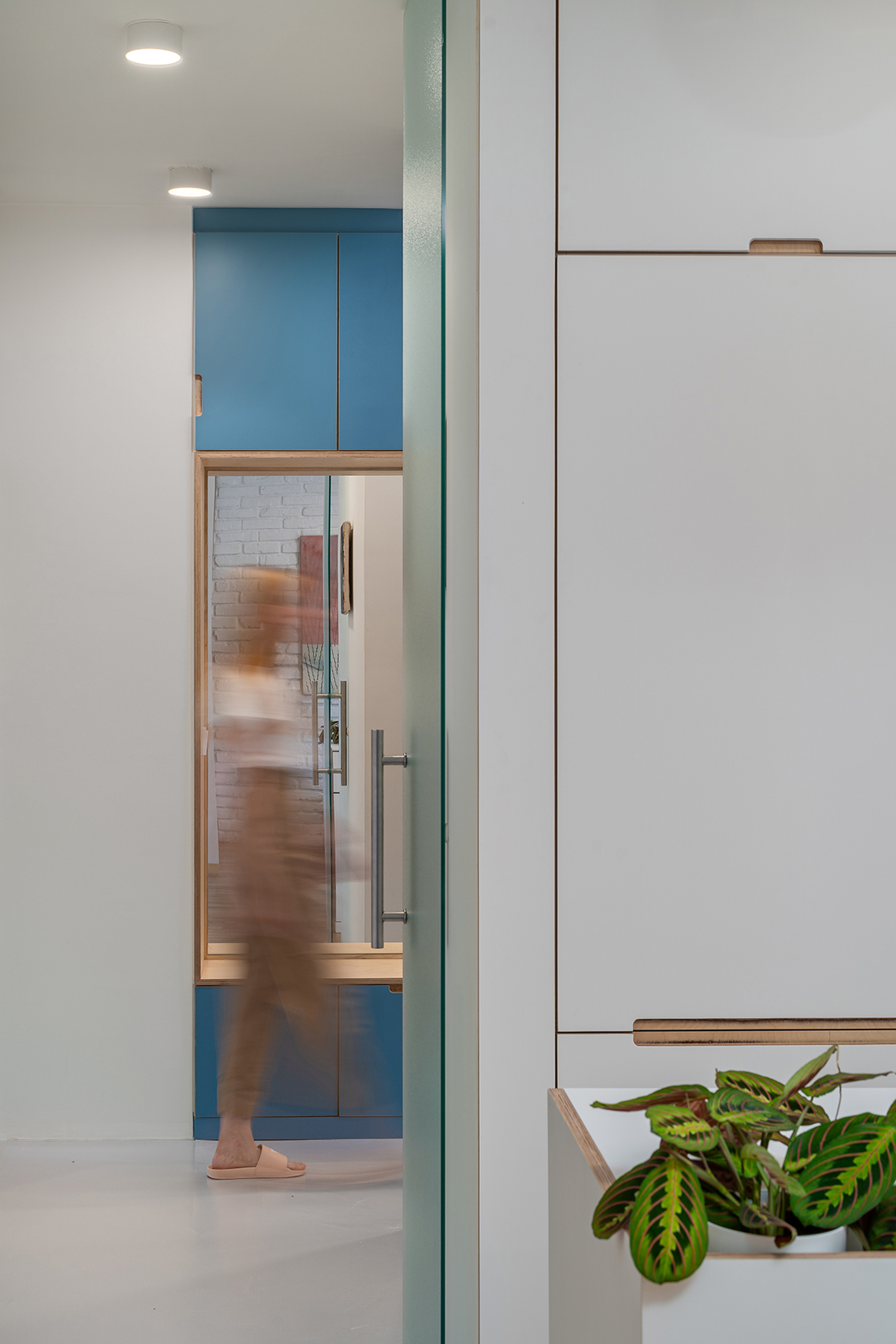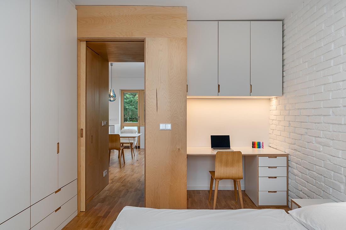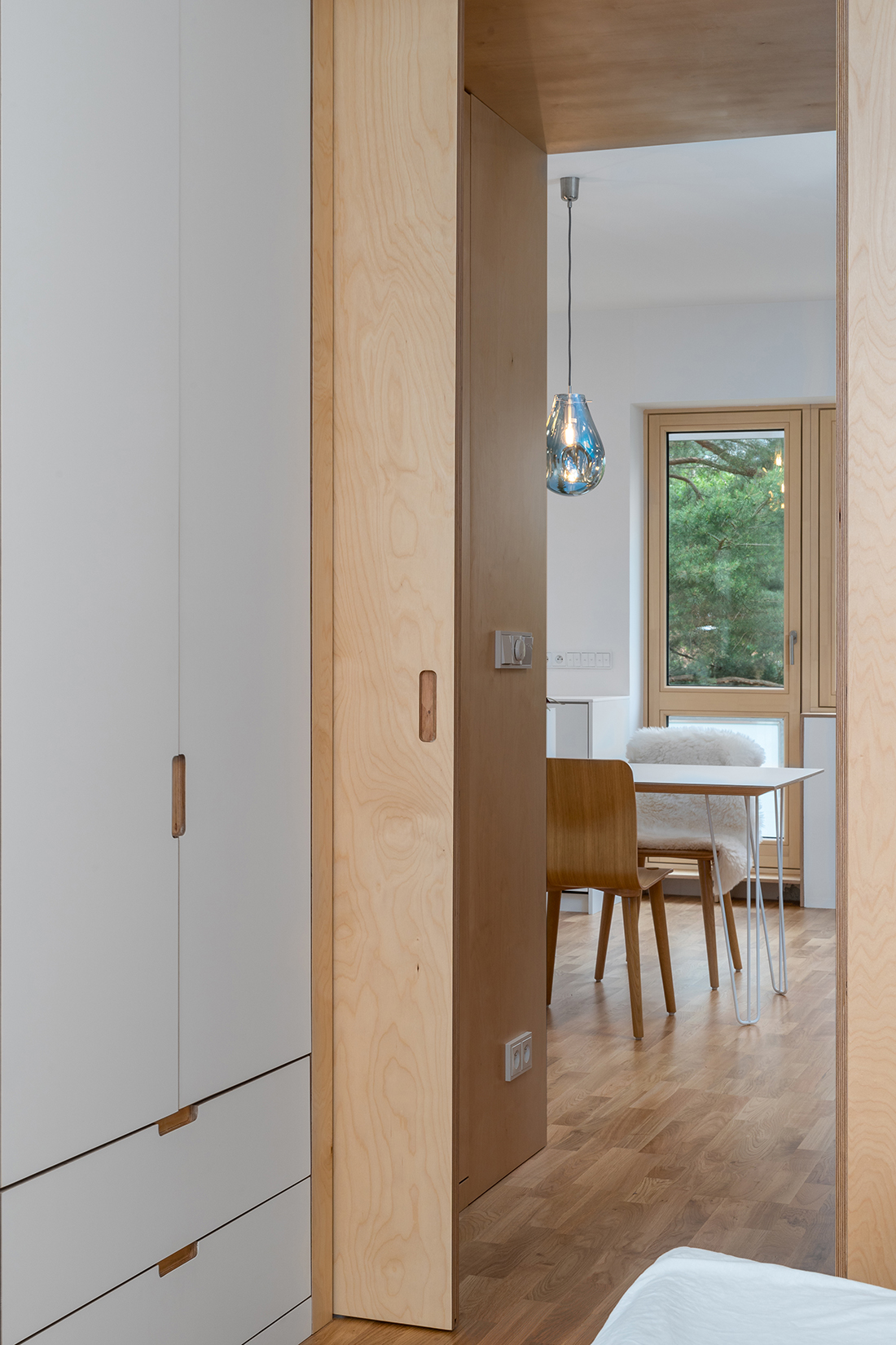 Plywood serves as the project’s principal material, chosen for its sustainability, affordability, and ability to highlight craftsmanship details. It was also used for tables and window sills. A pull-out dining table and a sliding wall introduce space-saving modularity, enhancing flexibility in the compact interior.